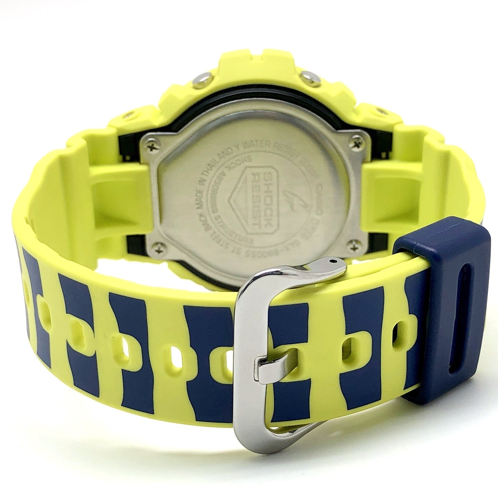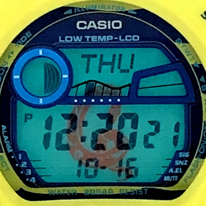 | コメント | 2019年5月に発売された、世界のトップアスリートから支持を受けるG-SHOCKのスポーツライン「G-LIDE(ジーライド)」のサーファーが鮫から身を守るために使用するウミヘビ柄をモチーフにしたモデルです。。ベースにはラウンドフェイスが人気の6900シリーズにサーファーの必須機能であるタイドグラフとムーンデータが搭載されたGLX-6900を採用。ベゼルとバンドにはマットな質感のイエローが採用され、バンドにはウミヘビ柄をイメージした縞模様がプリントされています。文字盤にも同様のデザインが施され、ELバックライト発光時にはウミヘビのアイコンが浮かび上がります。 |