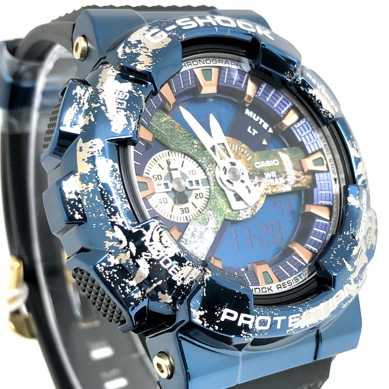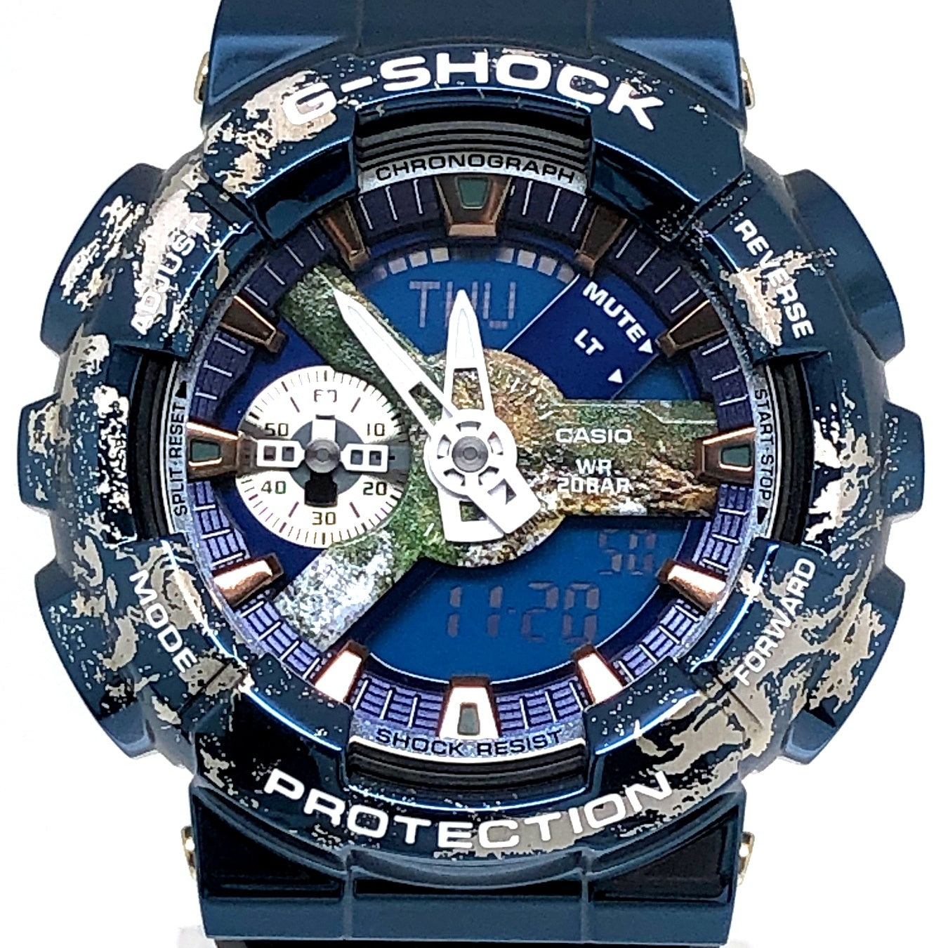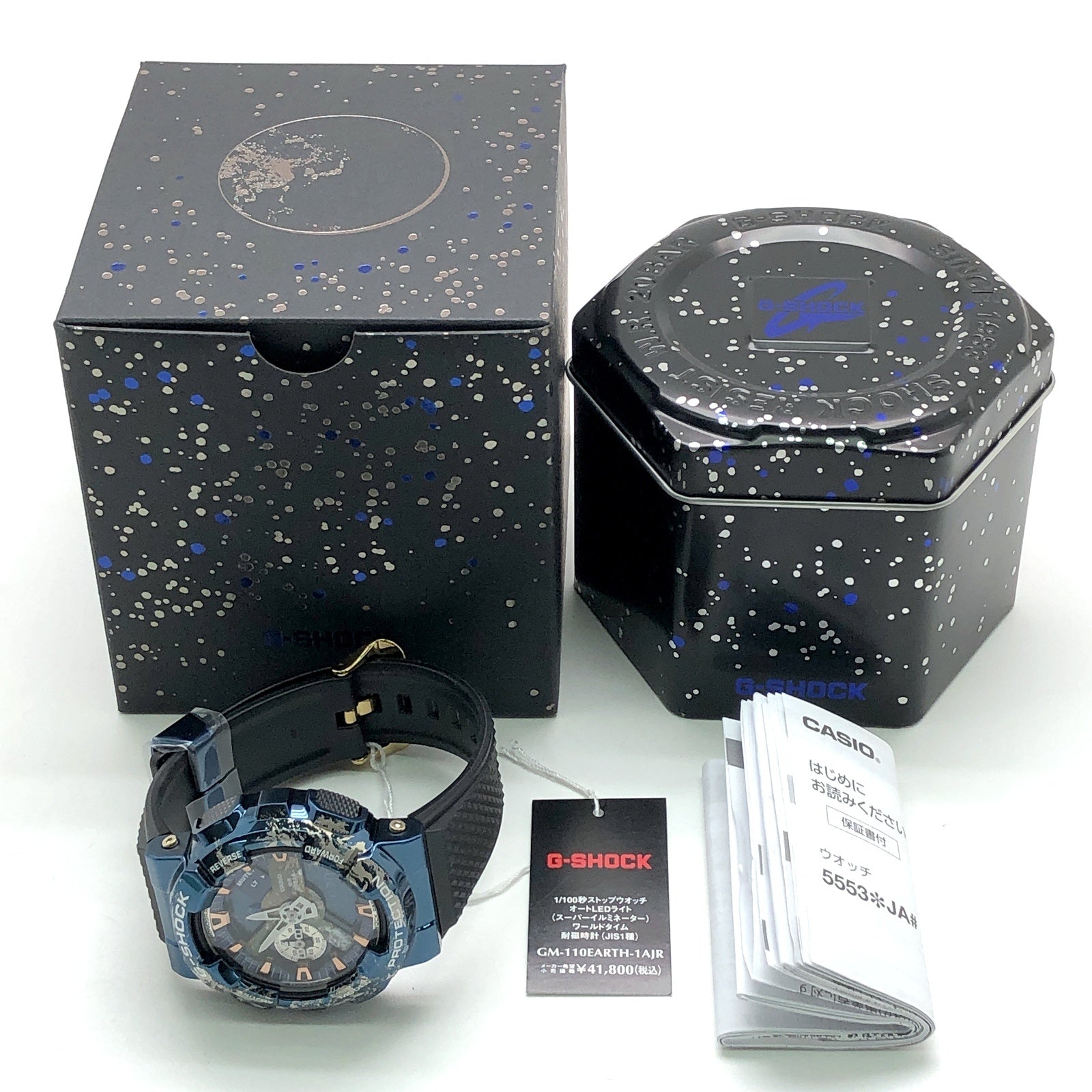 | コメント | 2022年12月に発売された「地球」をモチーフにしたモデル。ベースにはメタルベゼルのビッグケースモデルGM-110を採用。ベゼルと文字盤には美しい地球がデザインされ、メタルベゼルと遊環にはブルーIPが施されています。裏蓋にはブラックIPとレーザー剥離による「夜の地球」が表現されています。 |