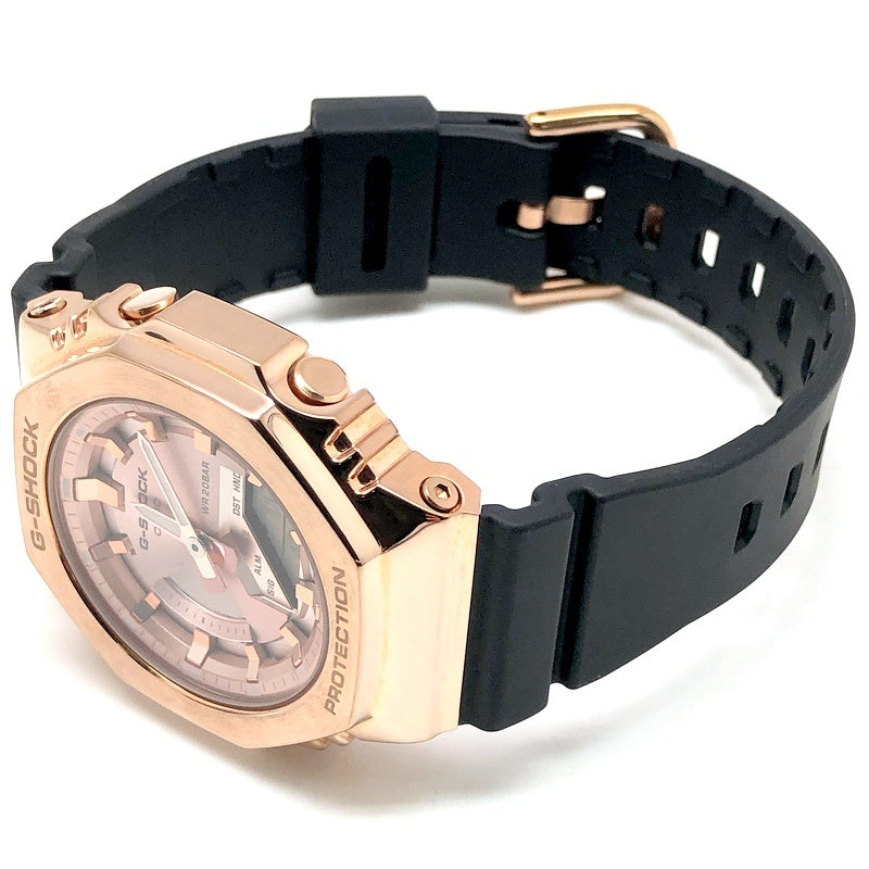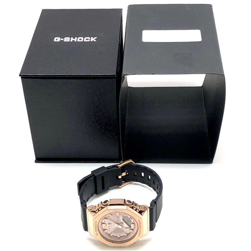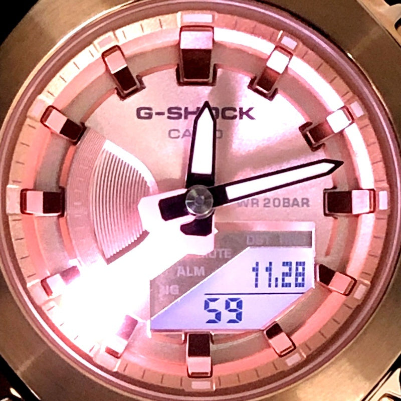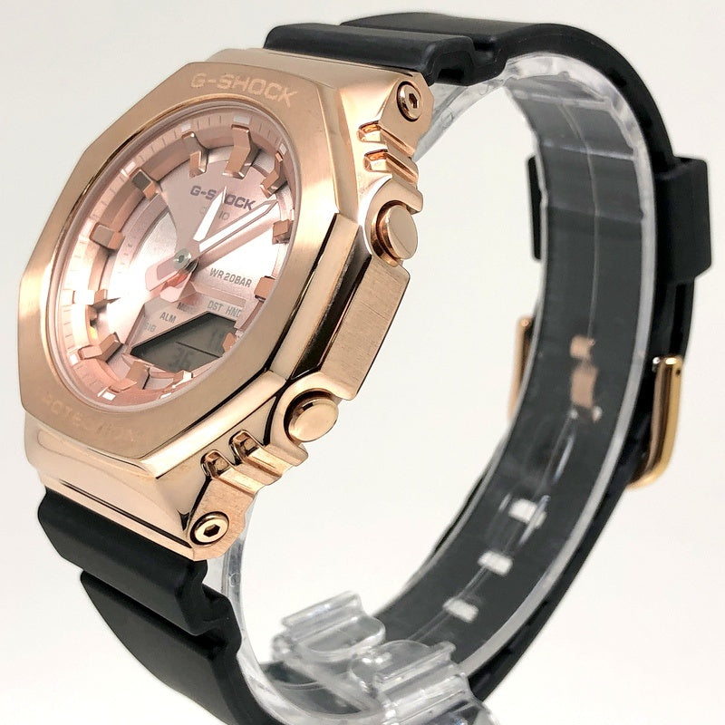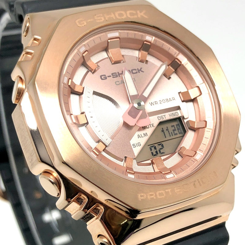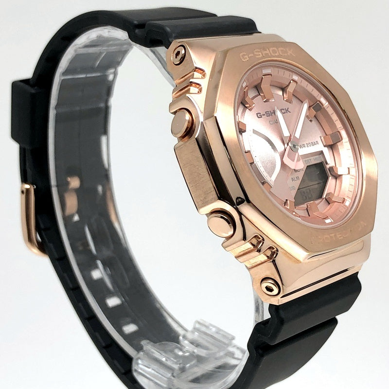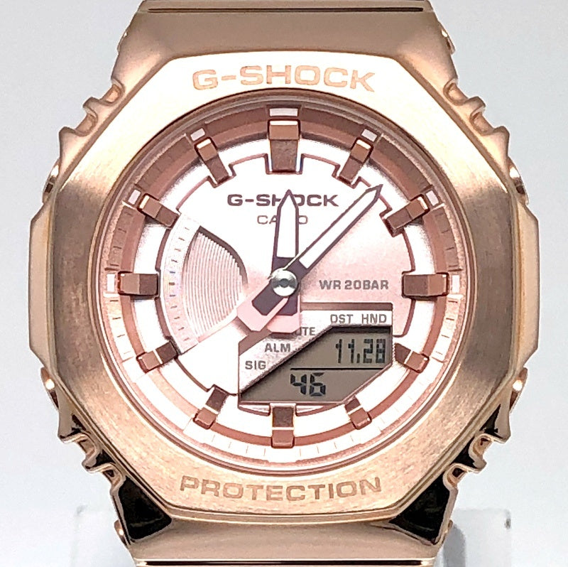 | コメント | 2023年8月発売に発売された、八角形のオクタゴンケースが採用されカシオークの愛称で親しまれているGA-2100シリーズを小型化したミッドサイズモデルGMA-S2100のメタルカバードです。ベゼルと尾錠にはピンクゴールドIPが施されたメタル素材が採用され、バンドにはブラックが配色されています。 |
