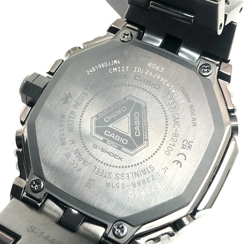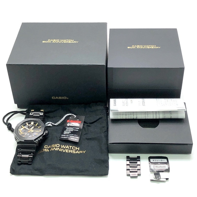 | コメント | 2024年10月にカシオウォッチの50周年を記念して発売されたモデル。ベースにはオクタゴンケースが人気の2100シリーズのフルメタルクロノグラフ「GMC-B2100」が採用。「0から1を生み出すものづくりの精神」をテーマに、新たな価値を生む「はじまりの灯火」をイメージしデザインされています。ベゼルとバンドにはブラックイオンプレーティング処理が施され、アクセントカラーには暗闇に輝く灯火をイメージしたゴールドが採用されています。バンドの1コマだけをゴールドカラーにし「50th ANNIVERSARY」の文字が刻印されています。裏蓋には「50周年記念ロゴ」が刻印されています。Bluetooth通信機能で専用アプリを接続することにより正確な時刻情報を取得することができます。 |