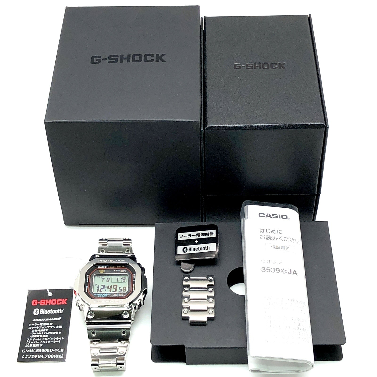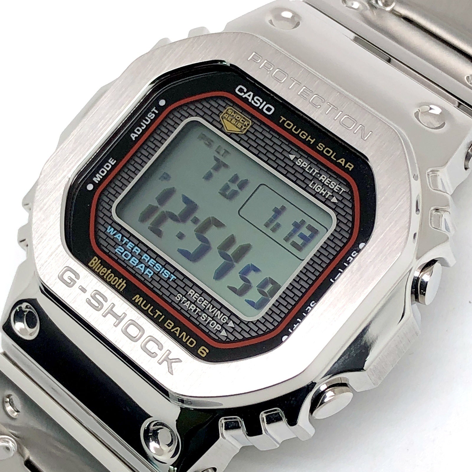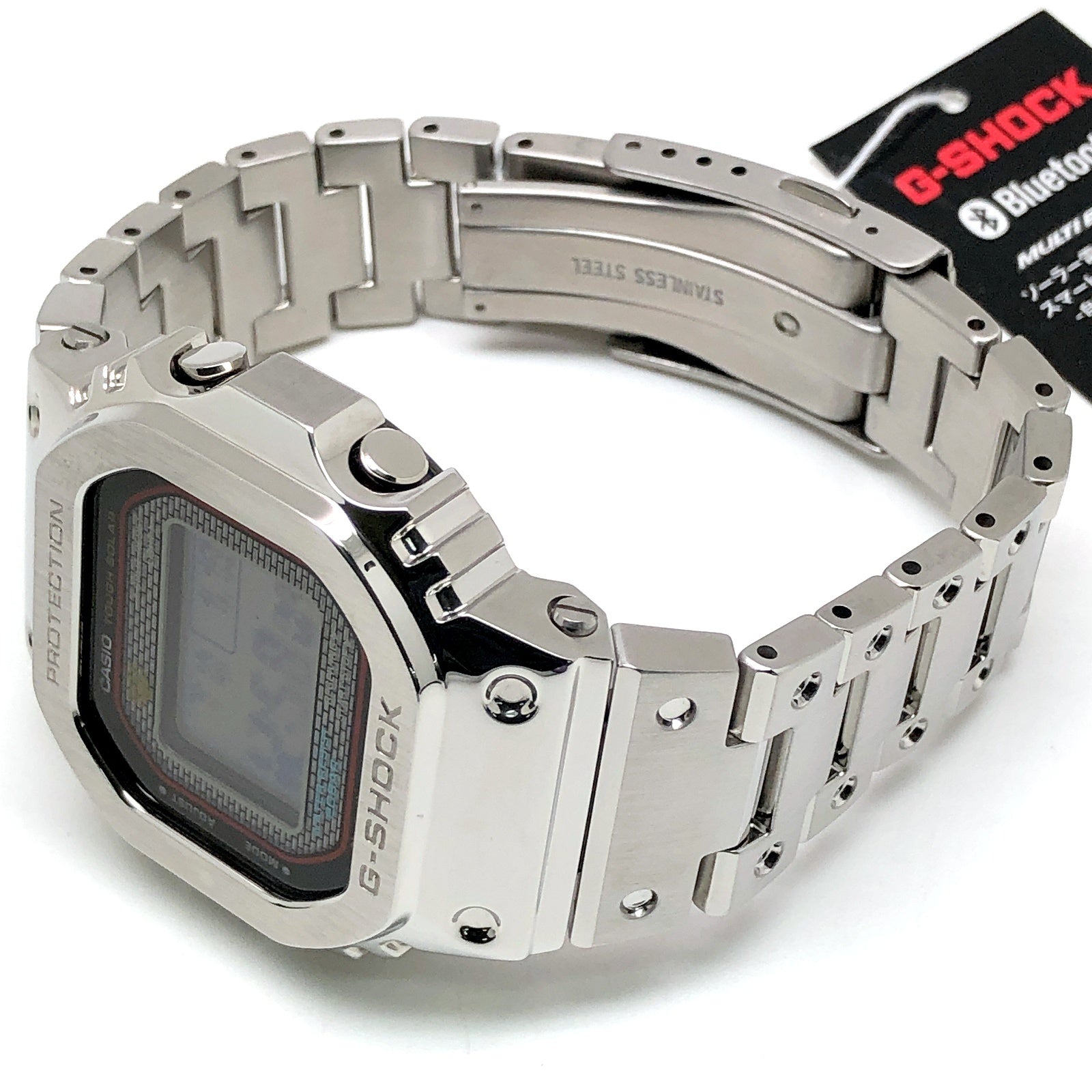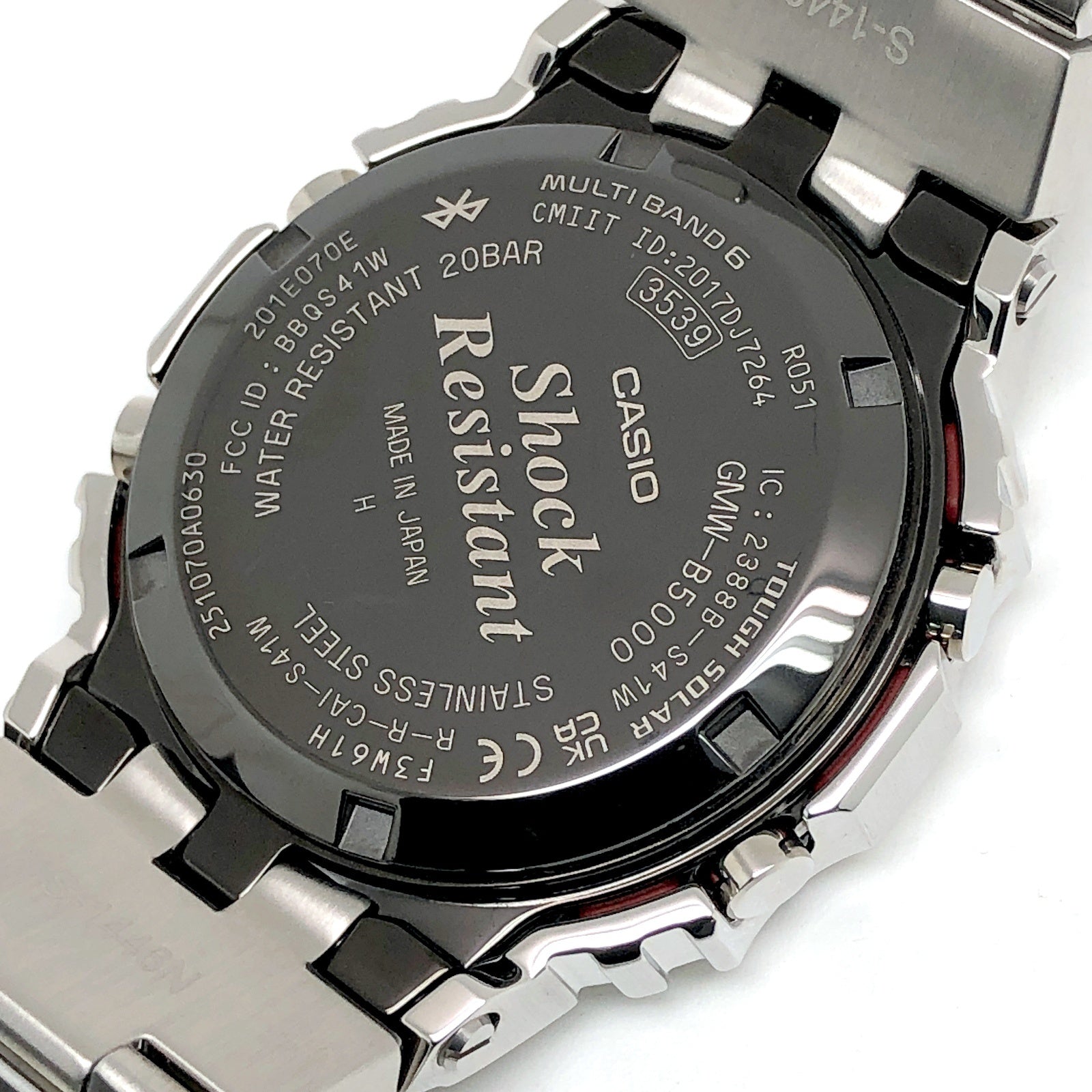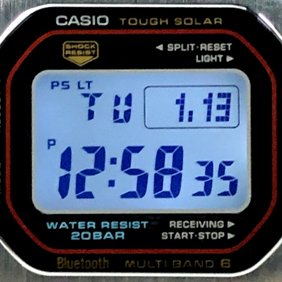| コメント | 2025年6月に発売された、G-SHOCK初号機のスクエアデザインはそのままに、スマートフォンリンクなどの先進機能を搭載し、フルメタル化したGMW-B5000シリーズに初代DW-5000C-1のダイヤルカラーが採用されたモデル。ベゼルやバンド、ケースに至るまでメタル化を実現し、裏蓋にはDLC処理が施されたスクリューバックが採用されています。バックライトには高輝度フルオートLEDライトを採用。タスソーラーとマルチバンド6の電波ソーラー機能に加え、Bluetooth通信機能でアプリと連動することで、より正確な時刻情報を取得することができます。 |