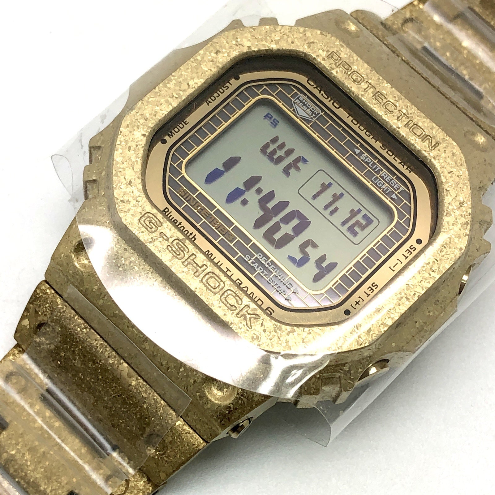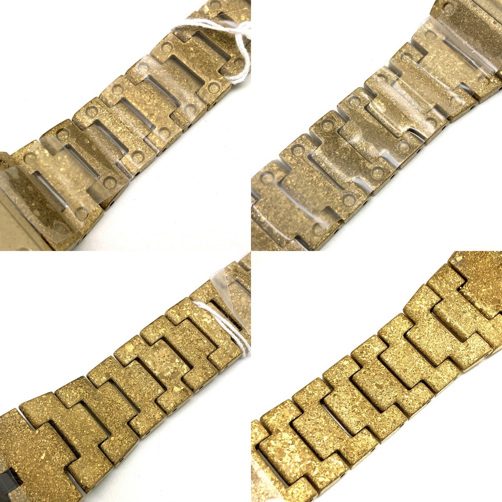 | コメント | 2023年4月に、G-SHOCKの誕生40周年を記念して発売された「RECRYSTALLIZED SERIES(リクリスタライズドシリーズ)」です。ベースにはタフソーラーとマルチバンド6の電波ソーラー機能とBluetooth通信機能が搭載されたフルメタルモデルのGMW-B5000を採用。ベゼルとバンドにはゴールドIPコーティングが施され、さらに再結晶化と深層硬化処理が施されています。これまでにない独特なザラついた質感で、40周年に相応しいデザインに仕上げられています。裏蓋にはエリックヘイズ氏がデザインした40周年記念ロゴが刻印されています。 |