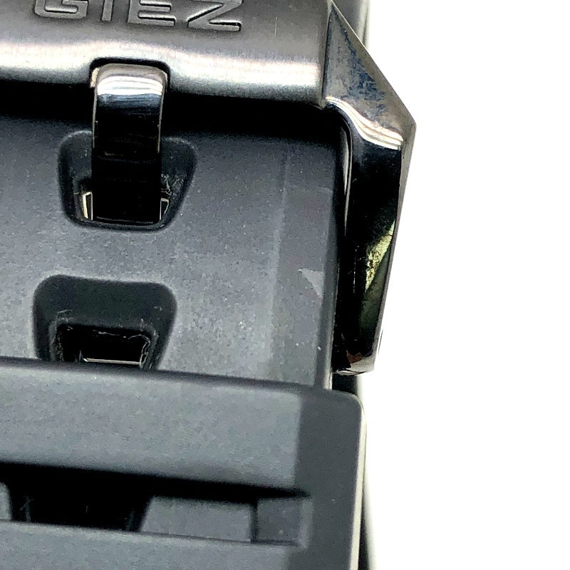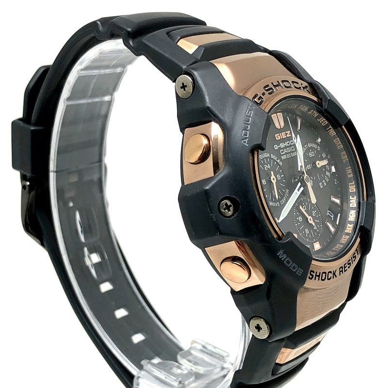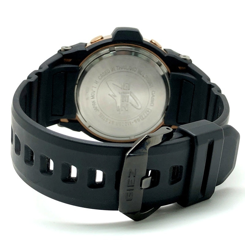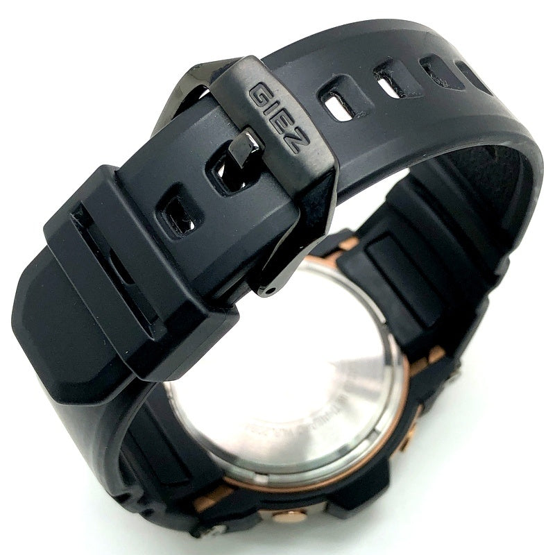 コメント | 2008年10月に発売された、洗練された大人のためのGIEZ(ジーズ)の「BLACK×GOLD Series(ブラック×ゴールドシリーズ)」。機能面では、タフソーラーとマルチバンド5の電波ソーラー機能が搭載され、6針・日付表示・曜日表示の高機能5モータークロノグラフモジュールが採用されています。デザイン面では、ケースやベゼル、サイドボタンやインデックスにローズゴールドが配色され、バンドにはブラックが採用されています。 |