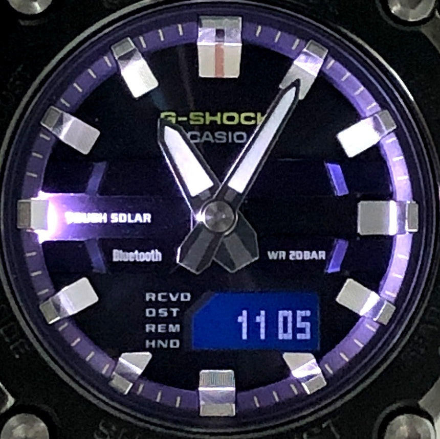 | コメント | 2024年2月に発売された、樹脂とメタルを融合させた「G-STEEL(ジースチール)」の小型化したミニサイズモデルです。シリーズ最薄の11.4mmを実現し、ケース径も人気のある42.3mmと小型化されています。ベゼルはシルバーメタルの上にブラックIPが施されたトップベゼルが重ね合わせられ、文字盤にはメタリックなパープルが配色されています。Bluetooth通信機能で専用アプリ「CASIO WATCHES」と連携することにより正確な時刻情報を取得することができます。 |