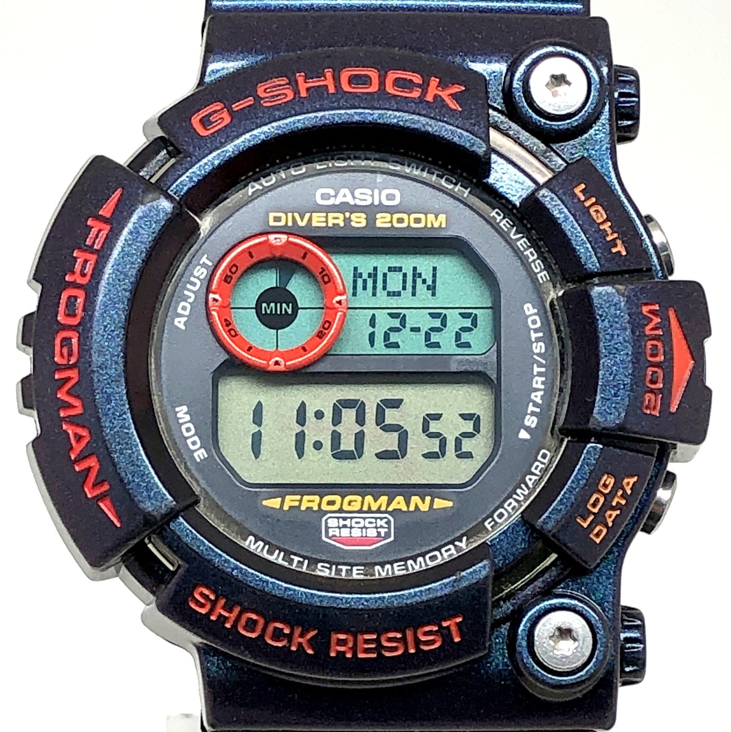 | コメント | 2001年8月発売された、偏光塗装でエキゾチックなカラーのFROGMANです。この独特なカラーの塗装から、Gショックファンからはマジョーラこと「毒蛙」と呼ばれています。裏蓋には潜水蛙が刻印され、ELバックライト発光時には毒マスクをつけた蛙が浮かび上がります。 |