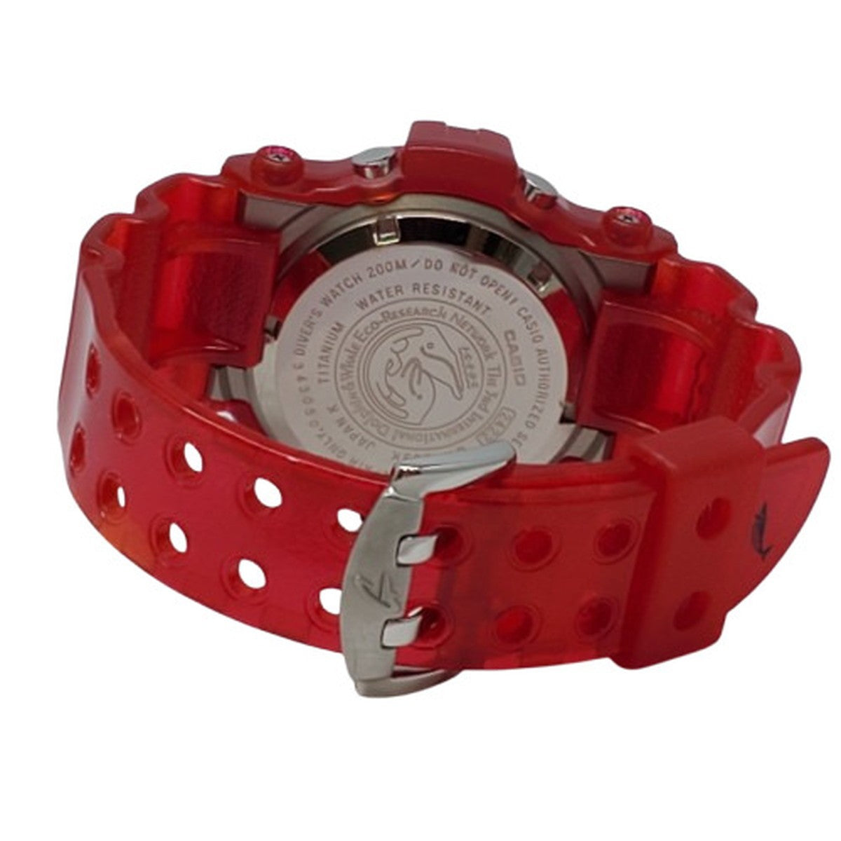 | コメント | 2003年6月に発売された第9弾のイルカクジラモデルのFROGMANです。ベルトとベゼルに採用されたビビットな赤いスケルトンカラーから、Gショックファンから「キャンディレッド」と呼ばれるモデルです。裏蓋にはアイサーチジャパンのロゴが刻印され、ELバックライト発光時にはブリーチングするクジラが浮かび上がります。 |