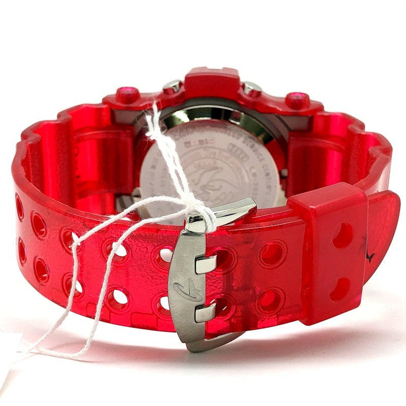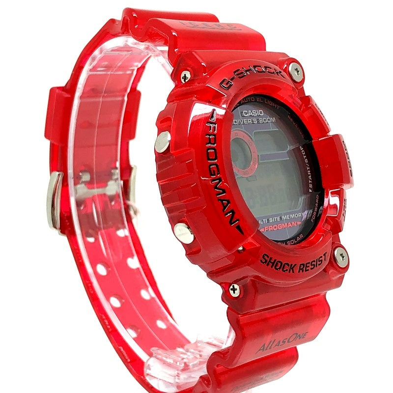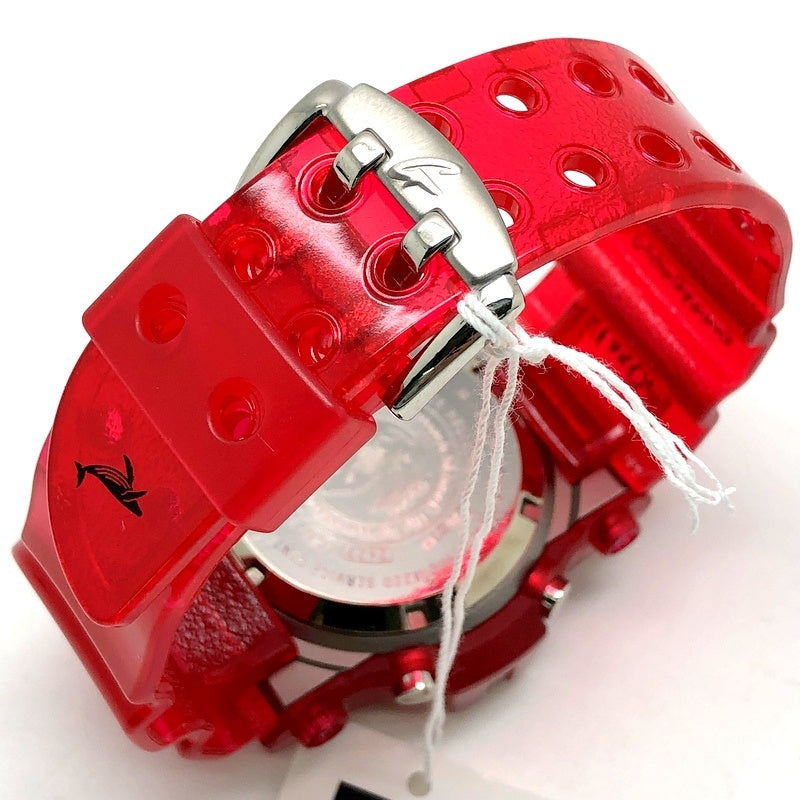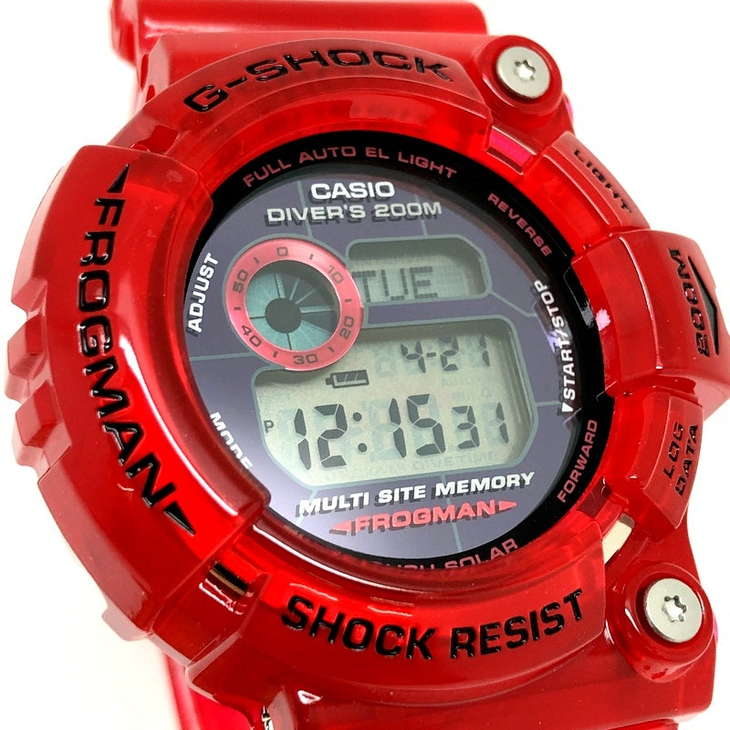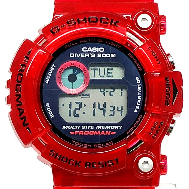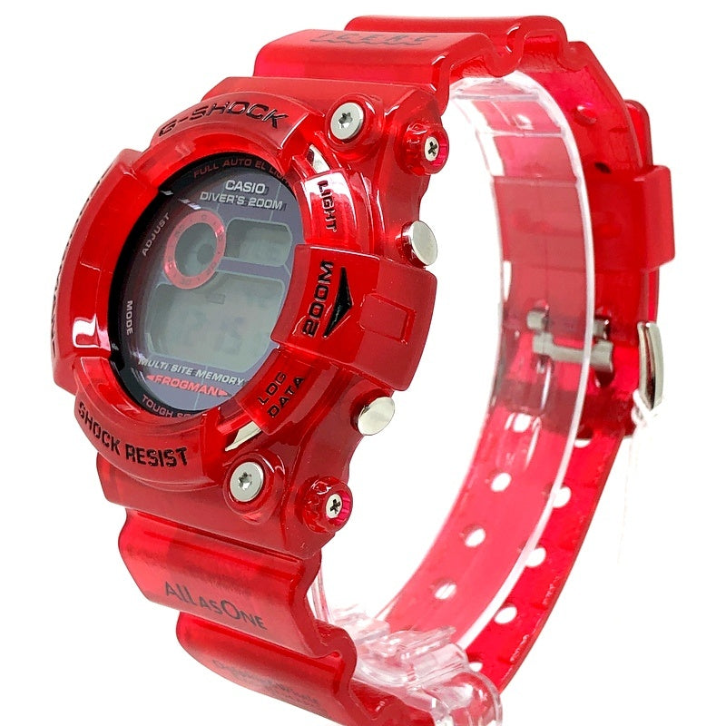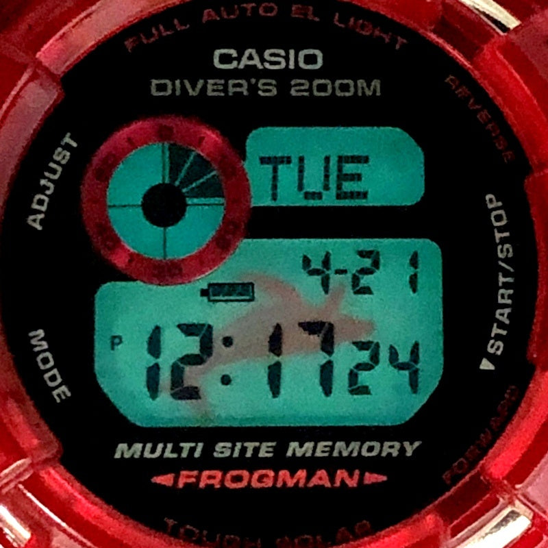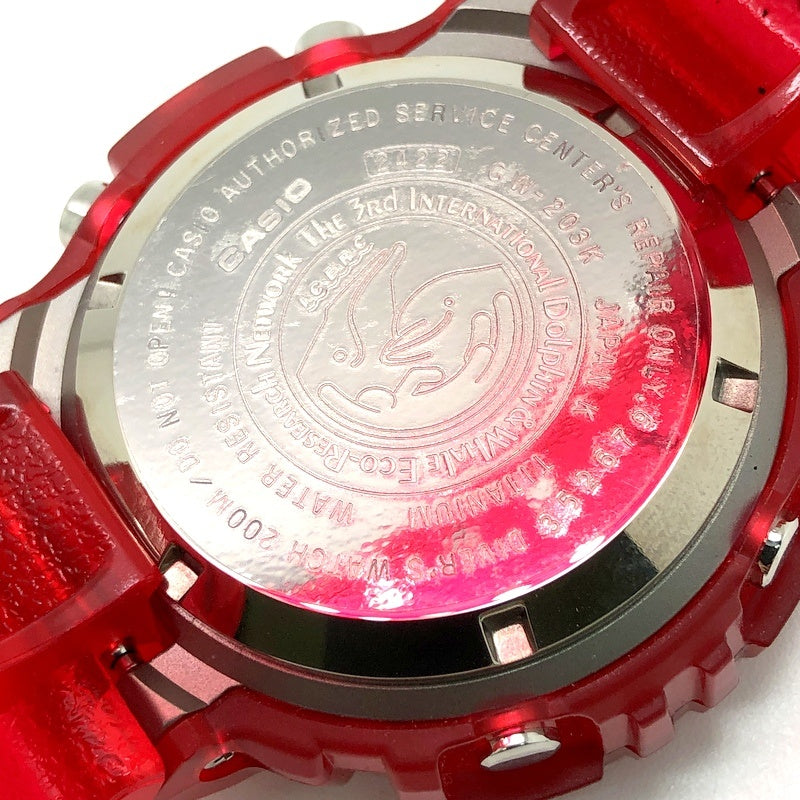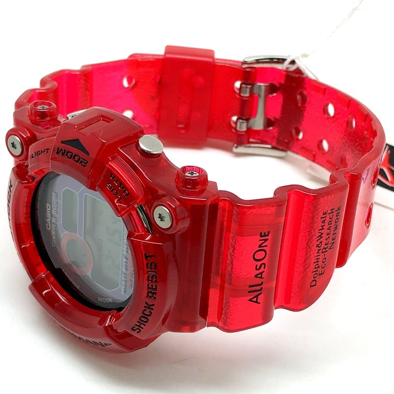 | コメント | 2003年6月に発売された第9弾のイルカクジラモデルのFROGMANです。ベルトとベゼルに採用されたビビットな赤いスケルトンカラーから、Gショックファンから「キャンディレッド」と呼ばれるモデルです。裏蓋にはアイサーチジャパンのロゴが刻印され、ELバックライト発光時にはブリーチングするクジラが浮かび上がります。 |