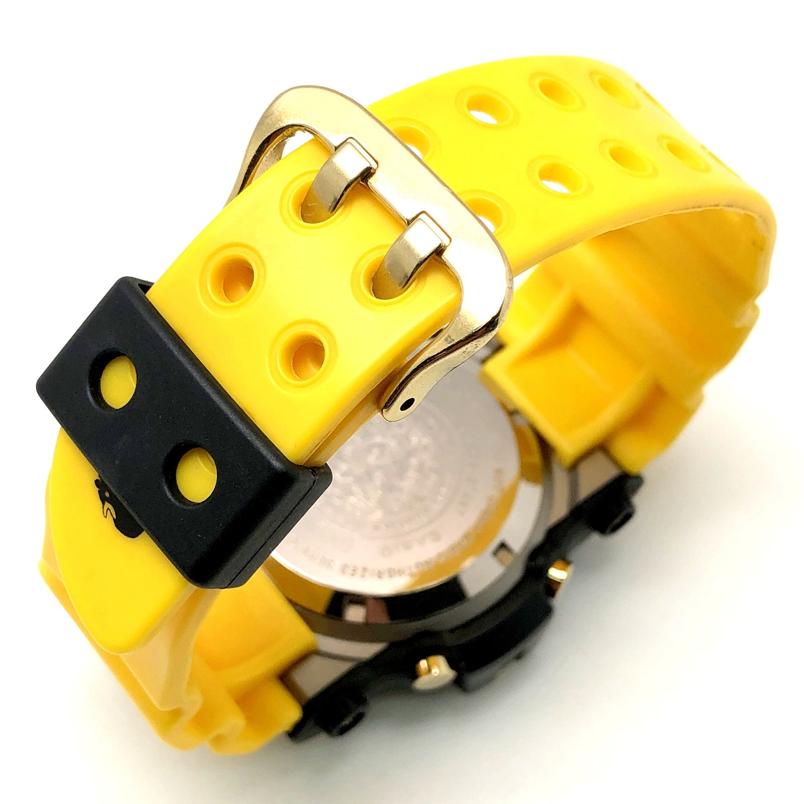 コメント | 2004年6月に発売されたイルクジ2004年モデルです。タフソーラーが搭載された4代目FROGMAN(フロッグマン)のGW-200をベースに、初代イルカクジラモデルの黒と黄のカラーリングを再現し復刻。裏蓋には「Love The Sea And The Earth」のシンボルマークが刻印され、ELバックライト発光時にはマッコウクジラが浮かび上がります。 |