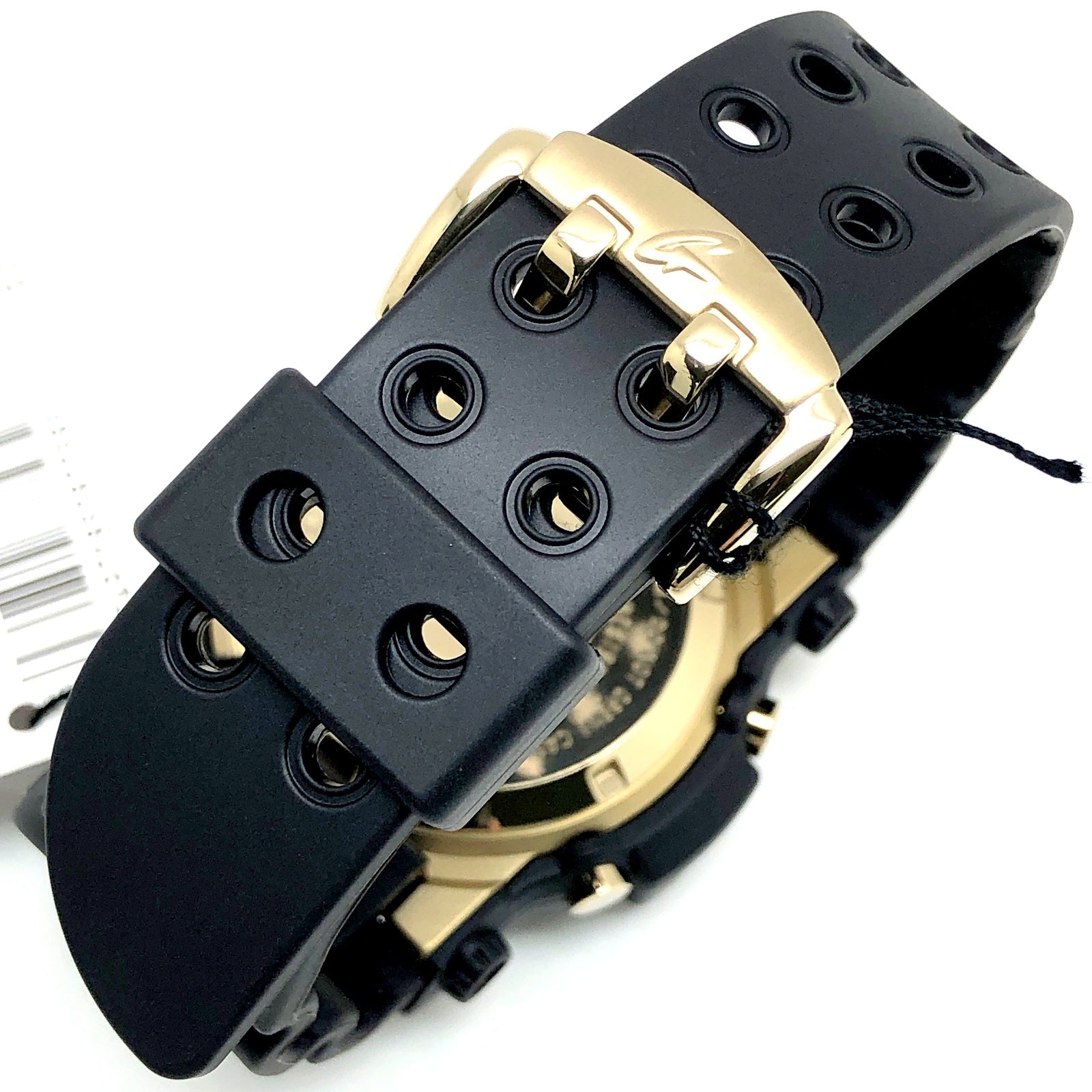 コメント | 2008年5月に25周年を迎えるGショックに先駆けて、2007年5月に発売された「25th ANNIVERSARY Dawn Black(始まりの黒)」のFROGMANです。ベルトとベゼルはGショックのメインカラーであるブラック、ボタンや尾錠、スクリューバックなどのメタルパーツや液晶にはスペシャルカラーのゴールドが採用されています。裏蓋には25周年記念ロゴが刻印されています。 |