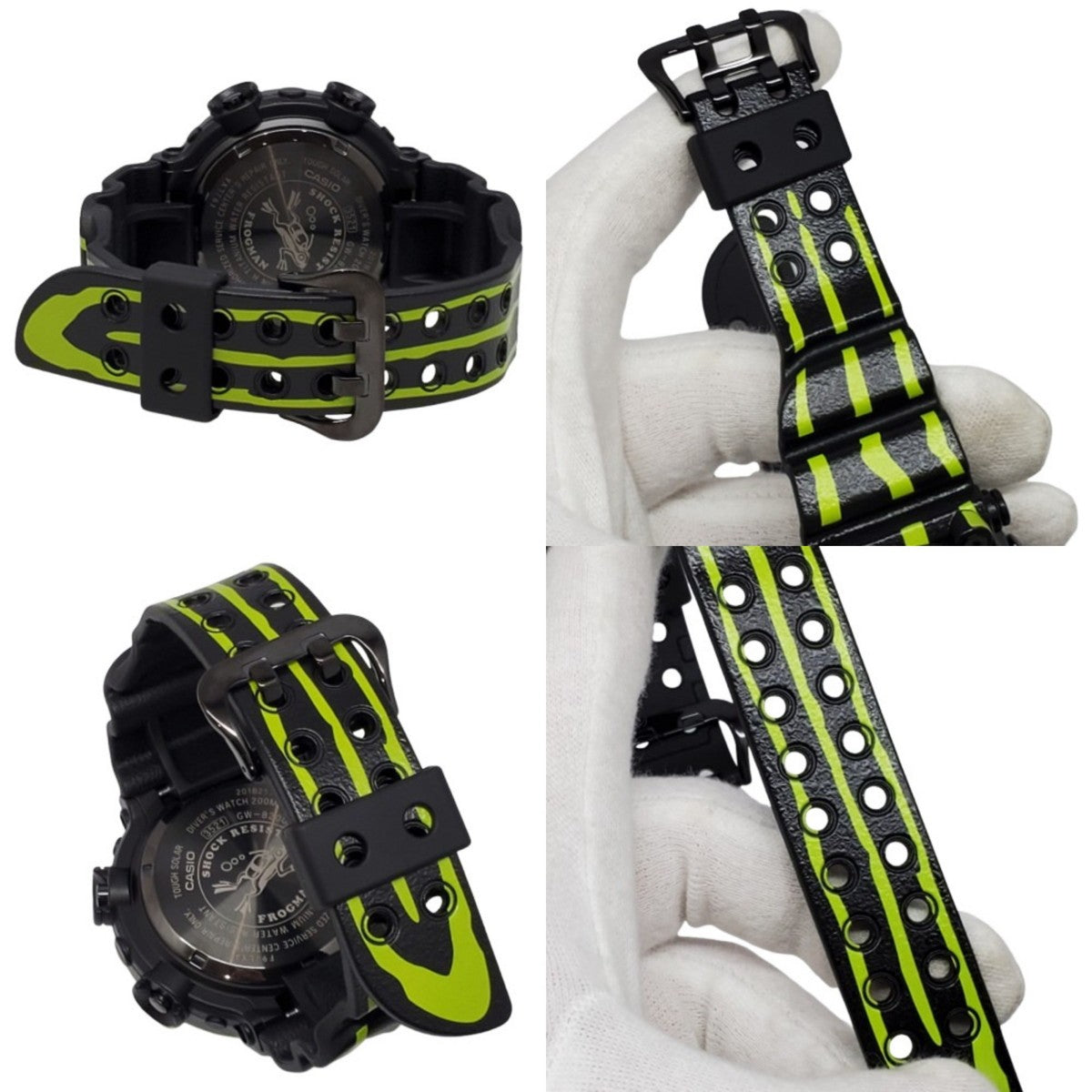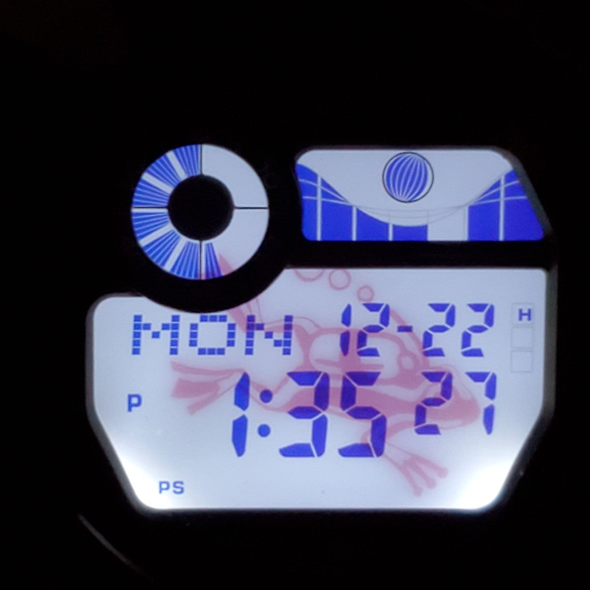 | コメント | 2025年12月に発売された、ヤドクガエルフロッグマンの第2弾モデルです。南アフリカの熱帯雨林に生息するミスジヤドクガエルをモチーフに、ベースにはタフソーラーが搭載されたGW-8200を採用。ベゼルとバンドにはミスジヤドクガエルのでこぼこの皮膚の質感を表現したスプレー塗装が施され、全体に大胆な蛍光グリーンの縦縞模様がデザインされています。裏蓋にはミスジヤドクガエル(潜水蛙)のキャラクターが刻印され、LEDバックライト発光時にも潜水蛙が浮かび上がります。 |