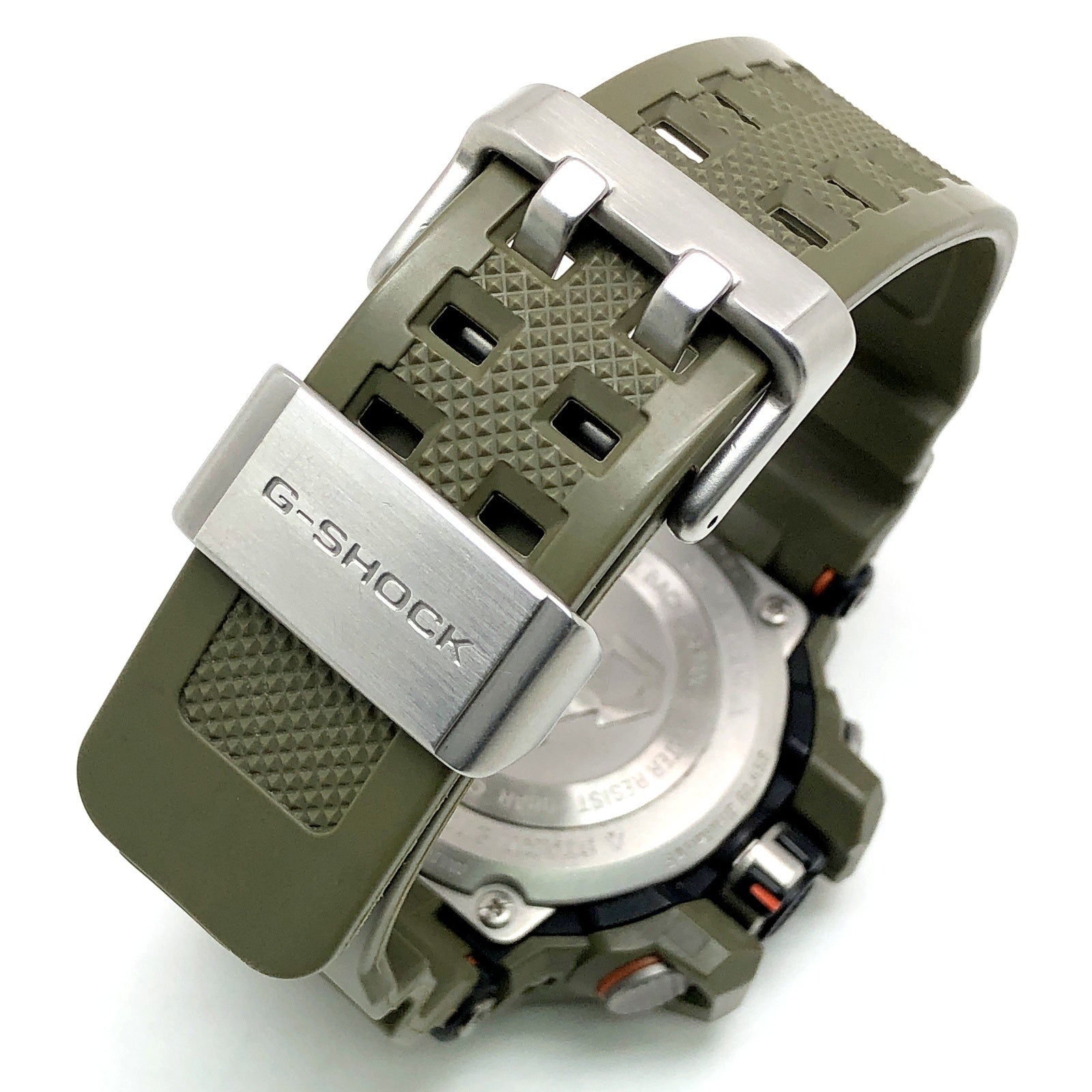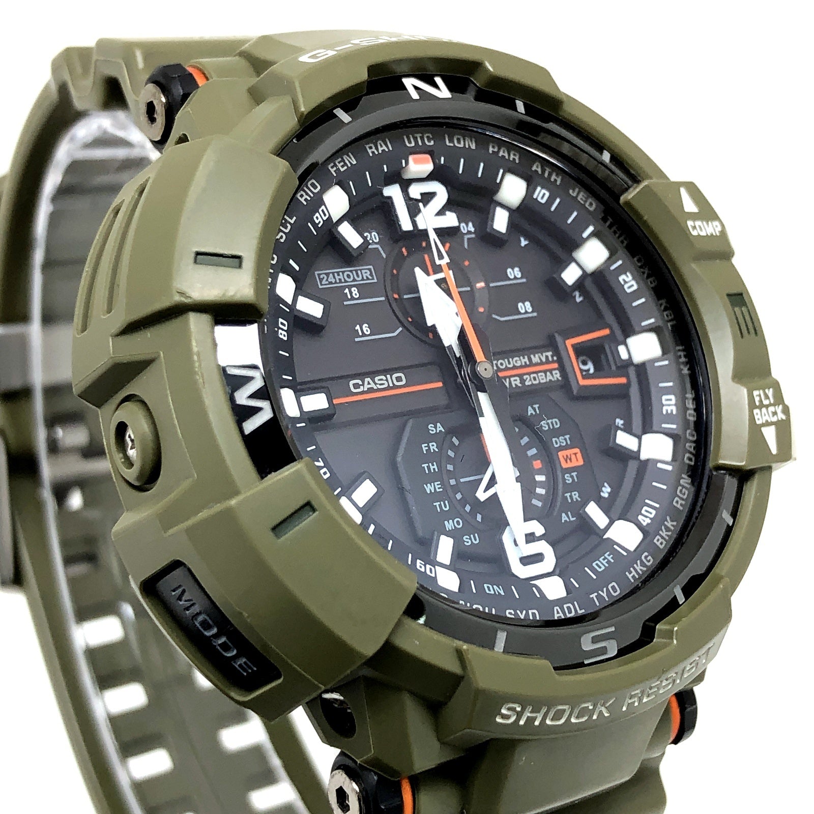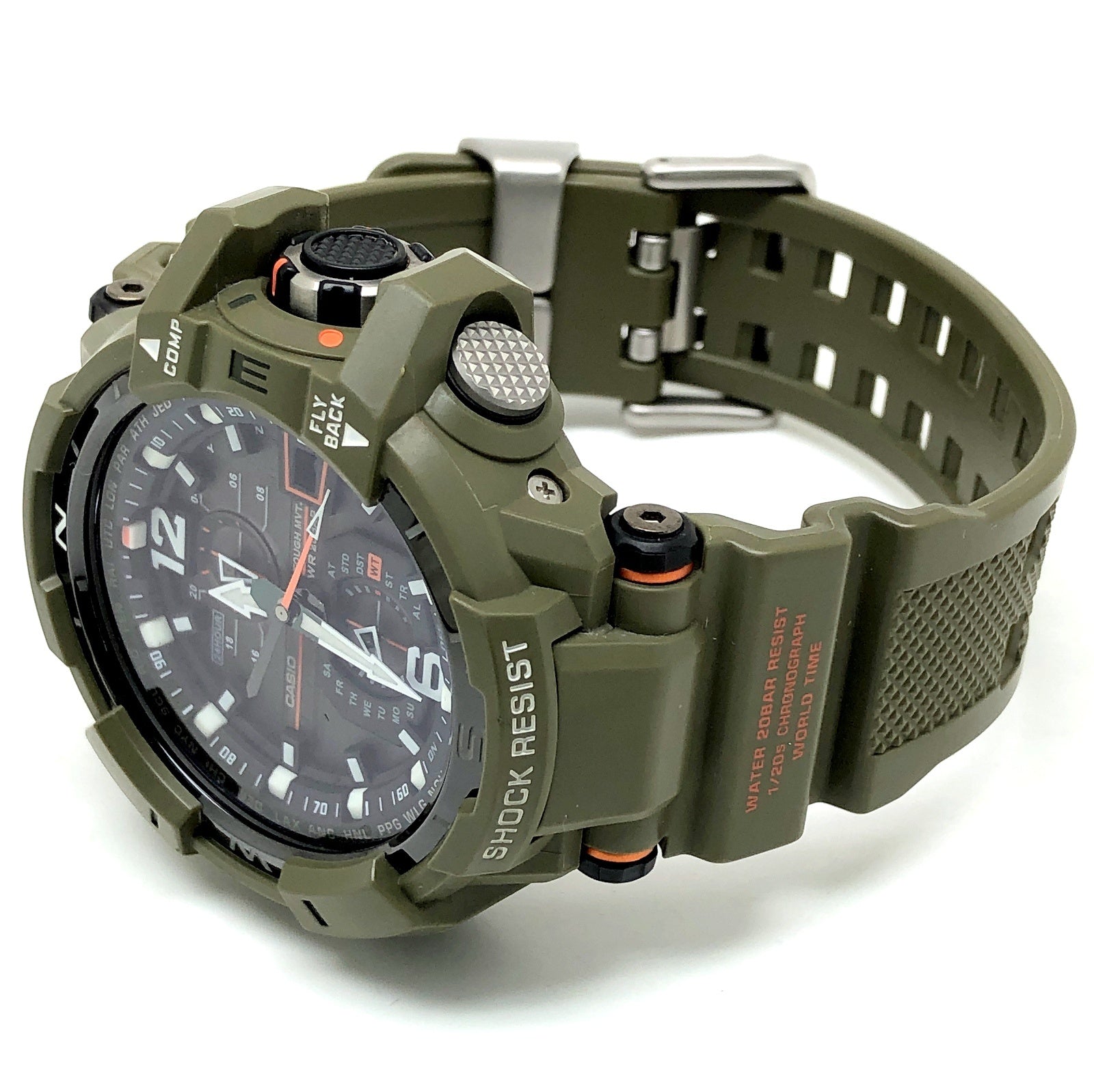 | コメント | 2016年10月に発売された、パイロットのためG-SHOCK「GRAVITYMASTER(グラビティマスター)」の「Master in OLIVE DRAB(マスターインオリーブドラブ)」。ベゼルとバンドにはフライトジャケットをモチーフに、オリーブドカラーであるカーキグリーンが採用され、アクセントカラーには裏地などに使用されるエマージェンシーカラーのオレンジが配色されています。タフソーラーとマルチバンド6の電波ソーラー機能とトリプルGレジスト(耐衝撃・耐遠心・耐振動構造)が搭載。風防には反射防止コーティングサファイヤガラスが採用され、視認性も高く、実用性も高いG-SHOCKです。 |