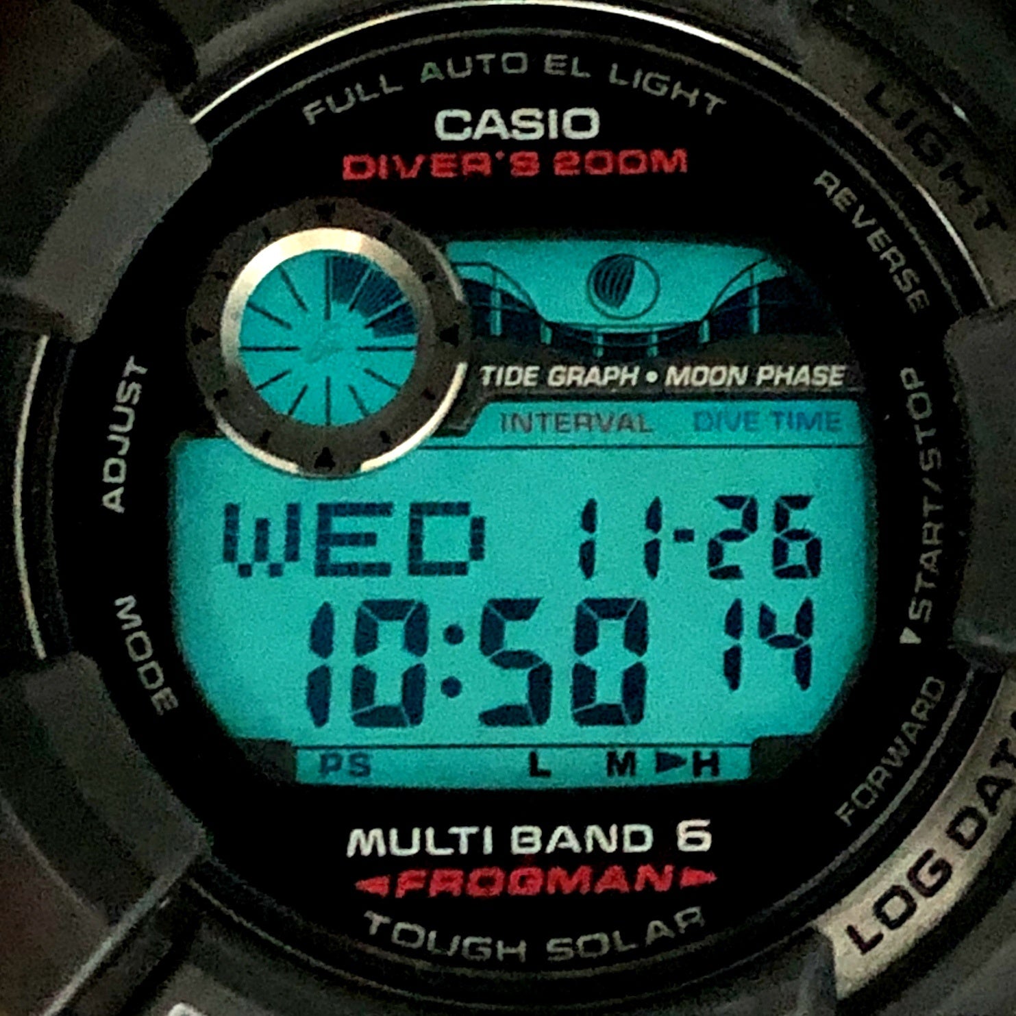 | コメント | 2009年9月に発売された4代目FROGMAN(フロッグマン)。タフソーラーとマルチバンド6を搭載し、電波ソーラーモデルに進化。潮の干満をグラフによって示してくれるタイドグラフやムーンデータ機能も搭載。裏蓋にはメカ蛙が刻印されています。 |