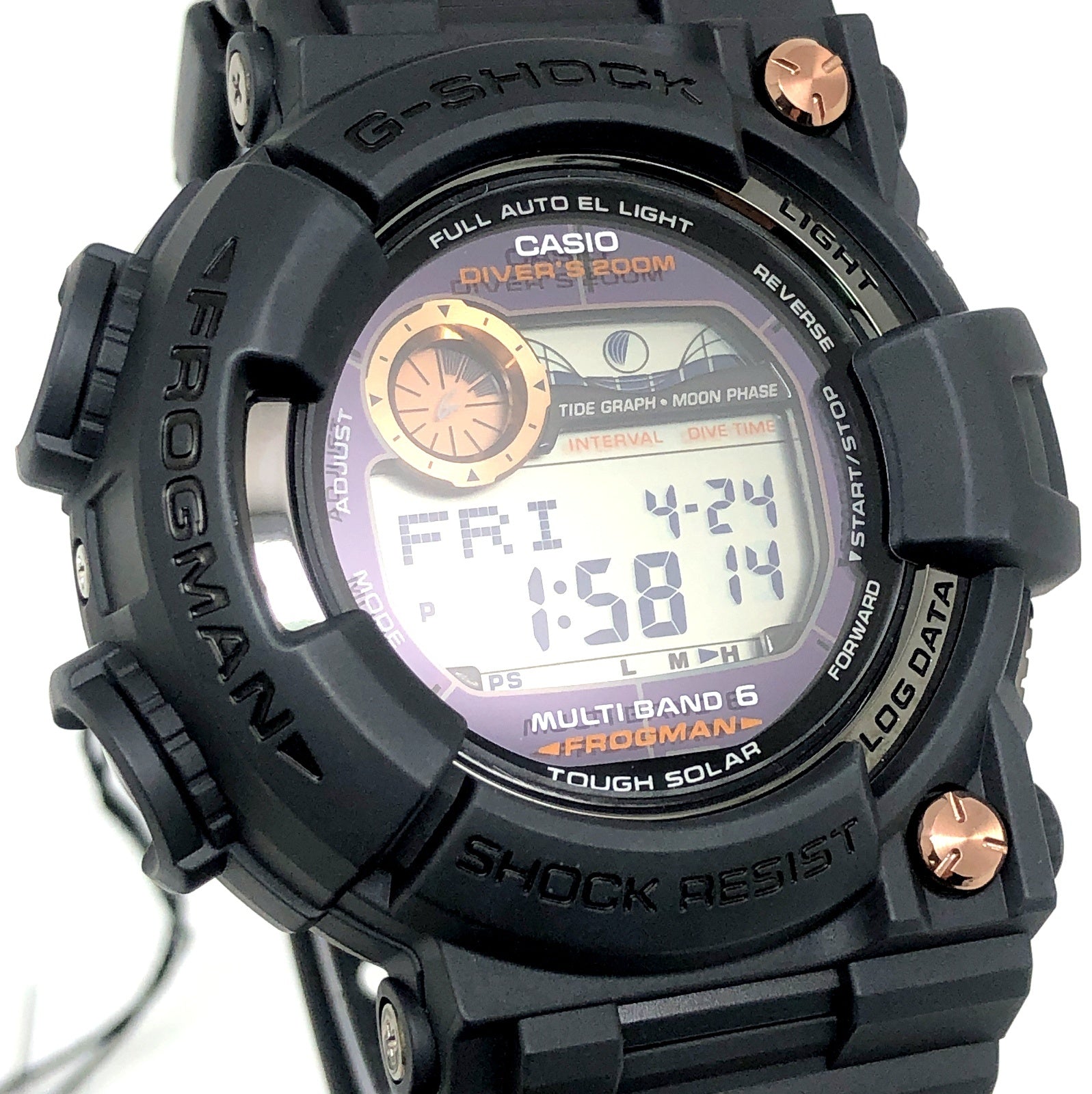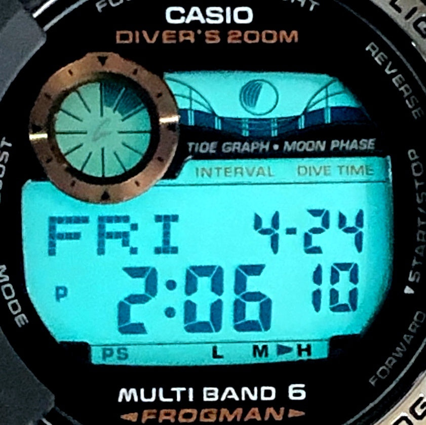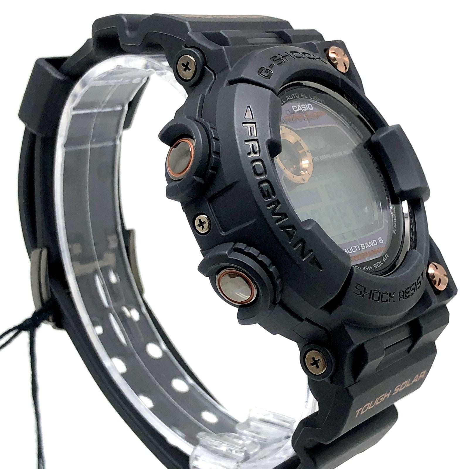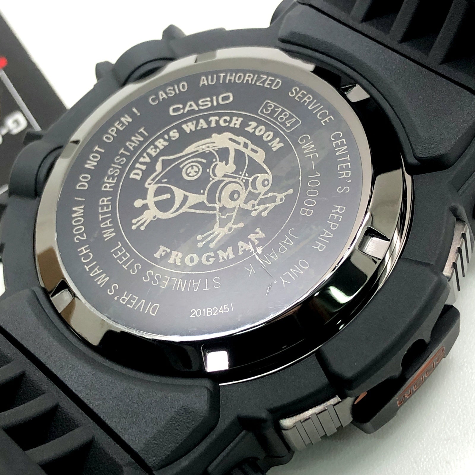 | コメント | 2009年10月に発売された、タフソーラーとマルチバンド6の電波ソーラー機能を搭載した6代目フロッグマンGWF-1000のスペシャルカラーモデル。ブラックにこだわりながら、フロントビスと文字盤のメタルパーツにローズゴールドが配色されています。DLC処理が施された裏蓋にはメカ蛙が刻印されています。 |