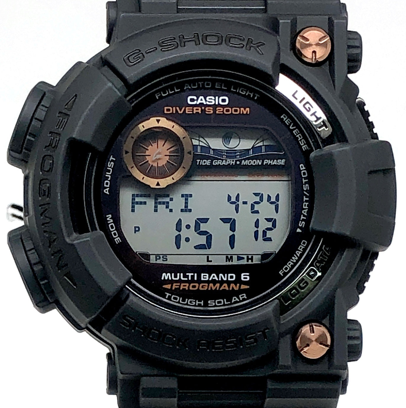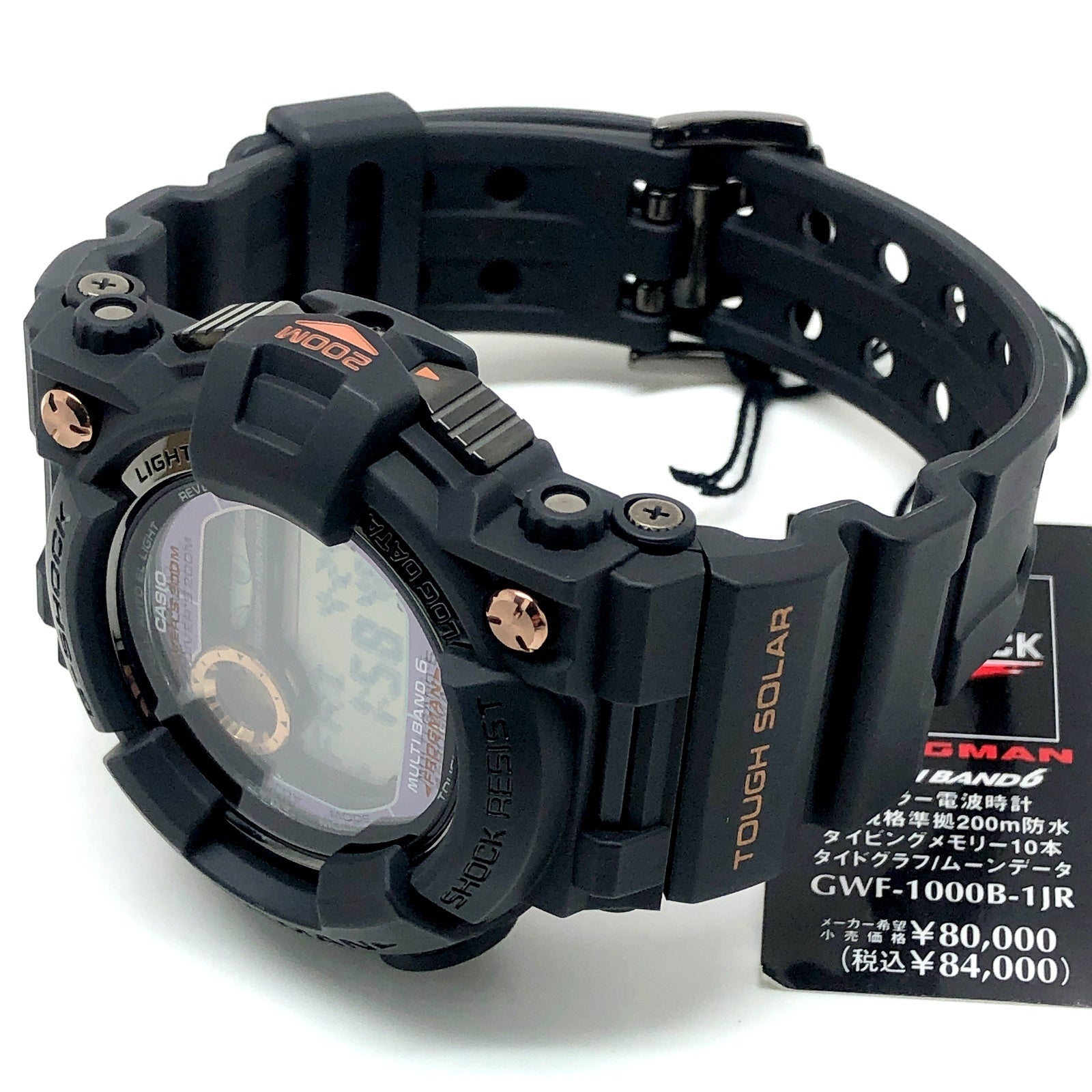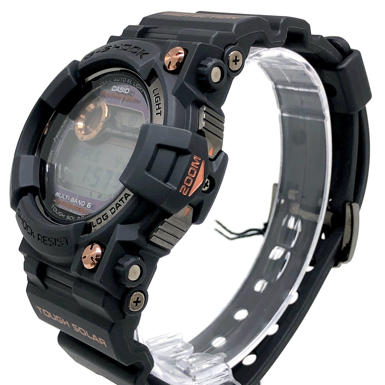 | コメント | 2009年10月に発売された、タフソーラーとマルチバンド6の電波ソーラー機能を搭載した6代目フロッグマンGWF-1000のスペシャルカラーモデル。ブラックにこだわりながら、フロントビスと文字盤のメタルパーツにローズゴールドが配色されています。DLC処理が施された裏蓋にはメカ蛙が刻印されています。 |