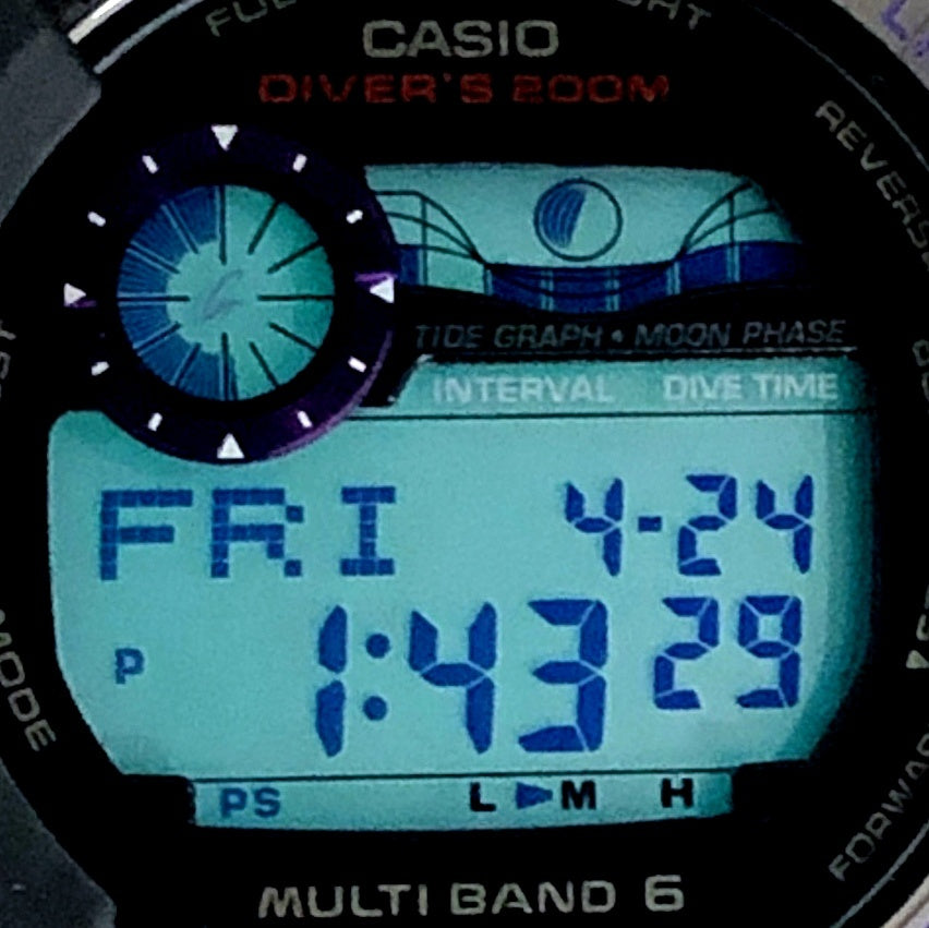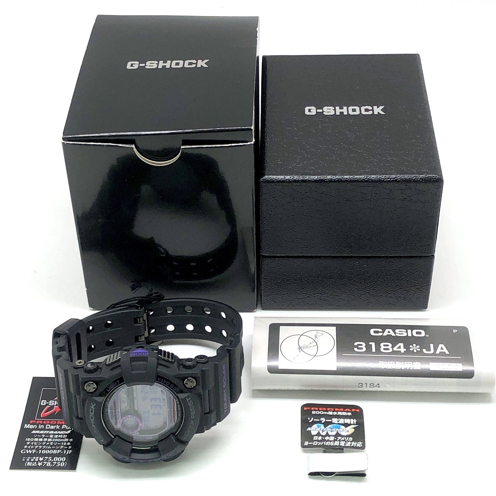 | コメント | 2011年3月に発売された、漆黒の闇をイメージしたカラーを紫で表現した「Men in Dark Purple(メンインダークパープル)」のFROGMAN。ベースにはタフソーラーとマルチバンド6の電波ソーラー機能と、本格ダイバーズ機能のタイドグラフとムーンデータが搭載された5代目フロッグマンGWF-1000を採用。ベゼルとバンドにはマットブラックが採用され、ロゴや液晶、グラフ表示リングやサイドボタンなど、随所にパーフルが配色されています。裏蓋にはメカ蛙が刻印されています。 |
