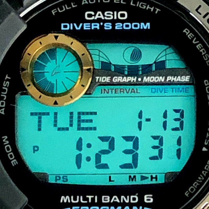 | コメント | 2010年3月に発売された、タフソーラーとマルチバンド6の電波ソーラー機能を搭載したFROGMANのスペシャルカラーモデル。1995年9月に発売され超プレミアム化した伝説的フロッグマン(通称:黒金蛙)の「DW-8200B-9A」を踏襲し、ブラックとゴールドでカラーを再現しています。ベゼルとバンドはマットブラックを採用し、サイドボタンやフロントビス、尾錠などにはイエローゴールドIPが施されたメタルパーツが採用されています。ケースや裏蓋には耐摩耗性に優れたDLC処理が施され、裏蓋にはメカ蛙が刻印されています。 |