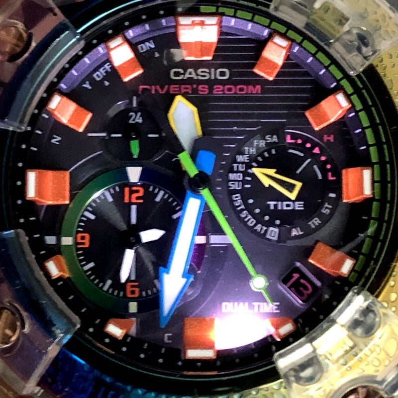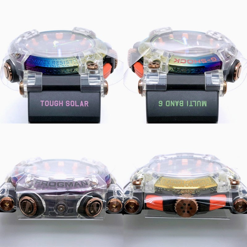 | コメント | 2020年10月に発売された、東南アジアのボルネオ島に生息するヒキガエルの希少種「ボルネオ・レインボー・トード(Borneo Rainbow Toad)」をテーマにしたスペシャルモデル。ベースにはアナログ表示のFROGMAN「GWF-A1000」を採用。エッチング加工で凹凸がデザインされているベゼルにはレインボーIPを施し、文字盤にカラフルなマルチカラーを配色することで、カエルの皮膚感や色が表現されています。裏蓋には「ボルネオ・レインボー・トード」をイメージしたカエルが刻印されています。 |