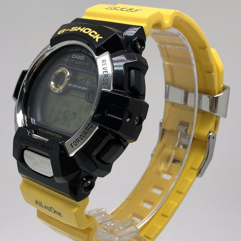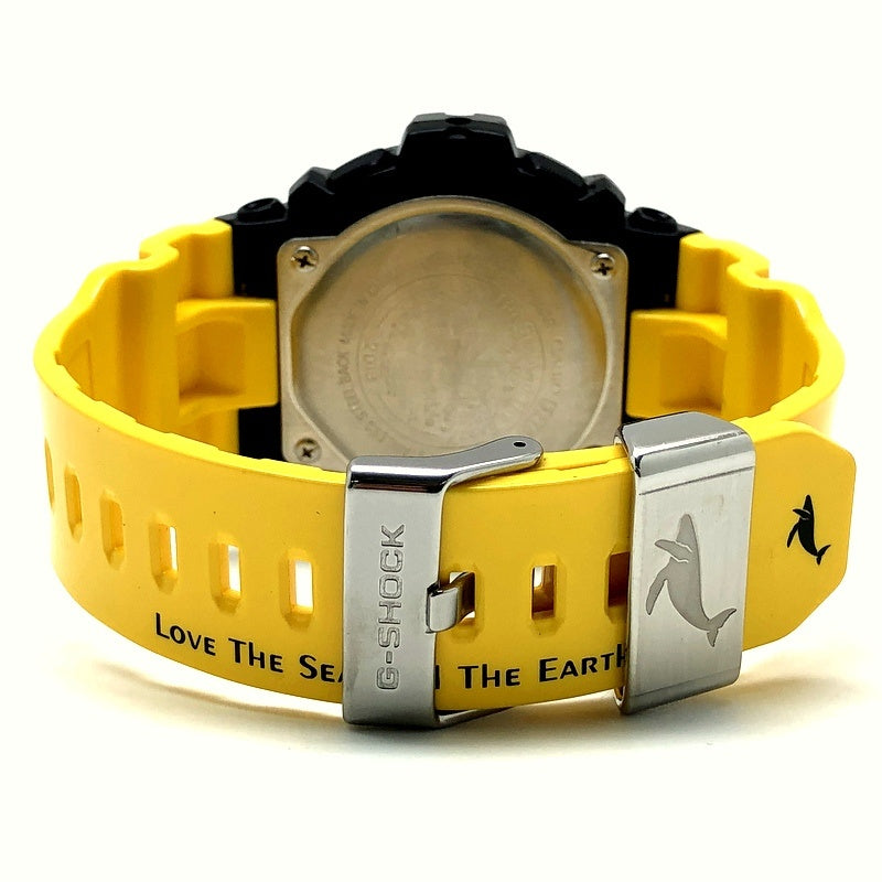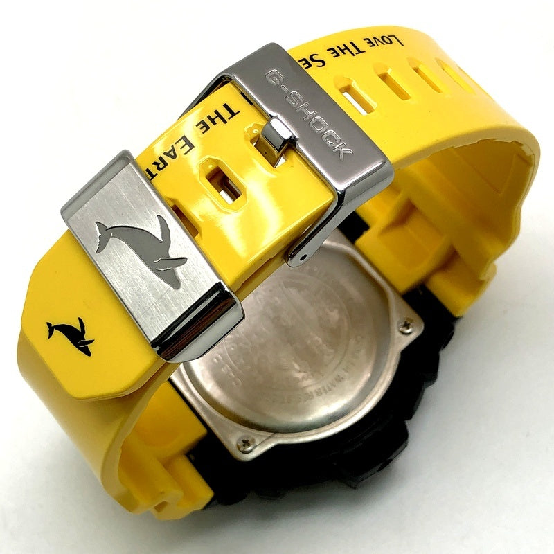 | コメント | 2013年6月に発売された、イルカ・クジラと自然の素晴らしさ伝える活動に取り組む「ICERC(アイサーチジャパン)」とのコラボレーションモデル「イルクジ2013」です。ベースにはG-LIDEのビッグケースモデルGWX-8900を採用。ベルトとベゼルには、初代カラーをモチーフに、光沢塗装が施されたイエローとブラックが配色されています。ベルトにはアイサーチジャパンのロゴがプリントされ、裏蓋には「Love The Sea And The Earth」のシンボルマークが刻印されています。LEDバックライト発光時にはクジラが浮かび上がります。 |