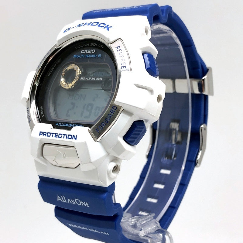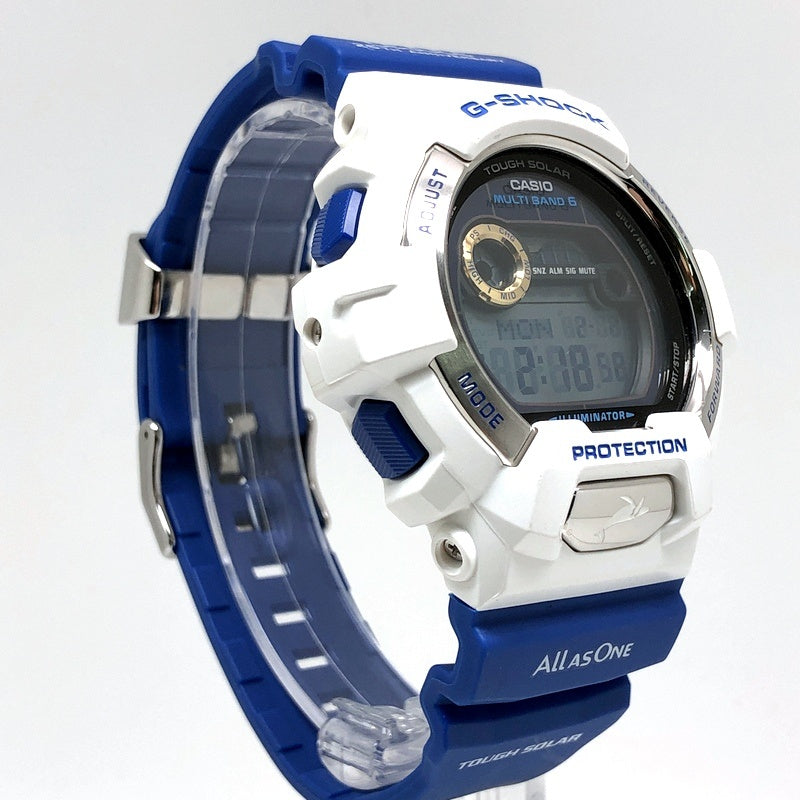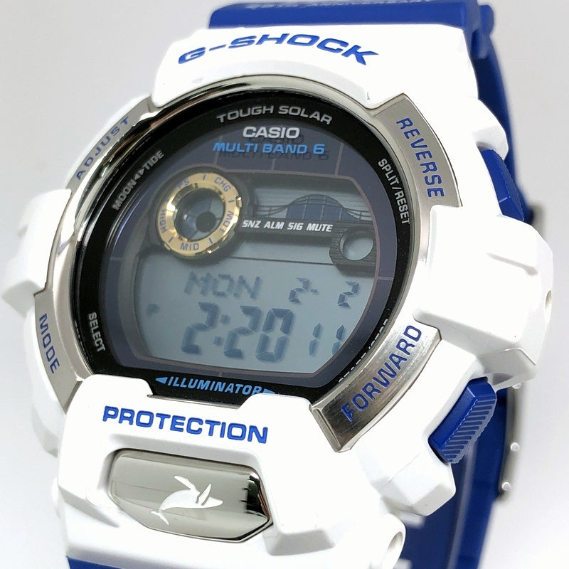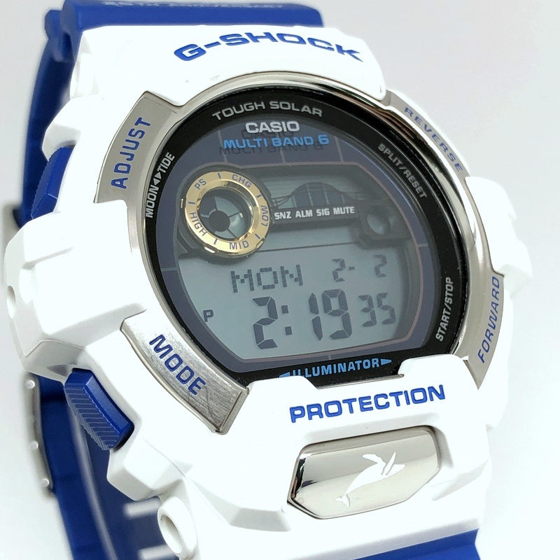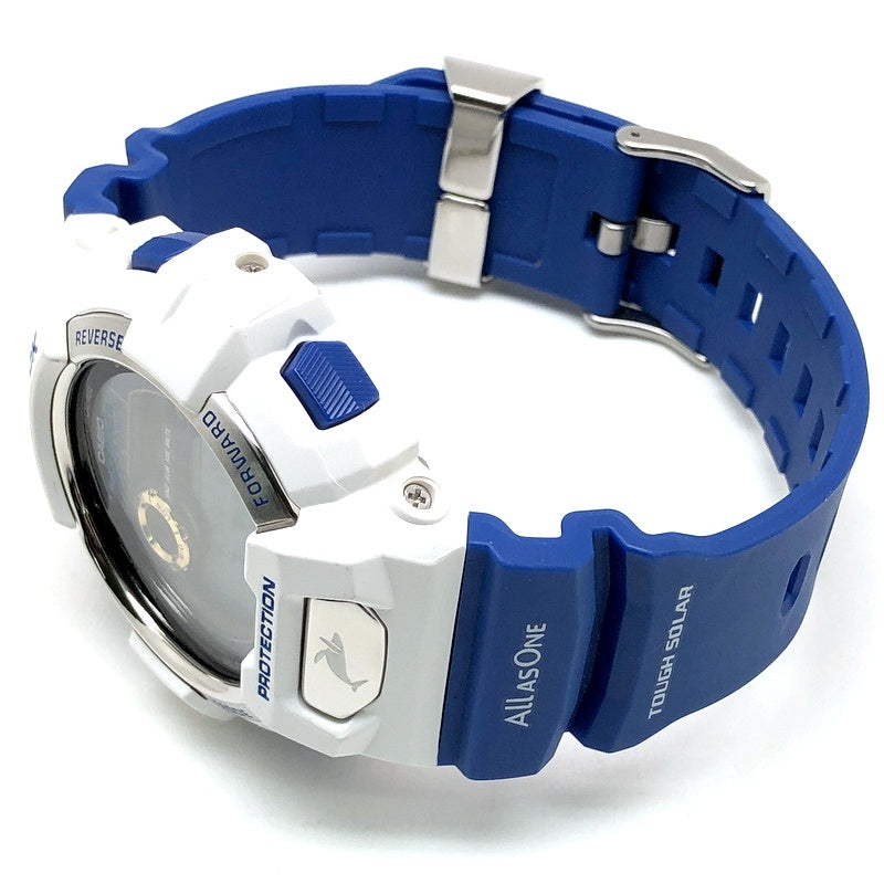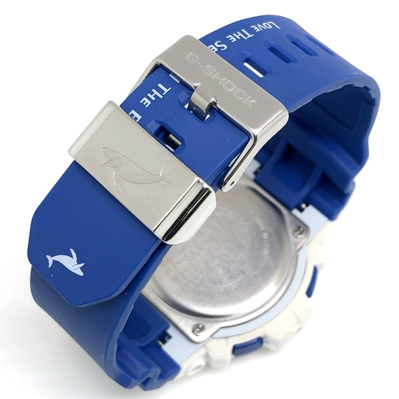 | コメント | 2016年6月に、イルカ・クジラと自然の素晴らしさを伝える活動に取り組んでいる環境団体「アイサーチ・ジャパン(ICERC)」の設立25周年を記念して発売された8900シリーズのイルカ・クジラモデルです。ベースには電波ソーラーとタイドグラフ・ムーンデータを搭載したG-LIDEのGWX-8900を採用。バンドには設立25周年を記念して「アイサーチ・ジャパン」のロゴに使用されているブルーが配色し、ロゴと「25TH ANNIVERSARY」の文字、テーマの「Love The Sea And The Earth」がプリントされています。裏蓋にはシンボルマークが刻印され、LEDバックライト発光時には「アイサーチロゴ」が浮かび上がります。 |
