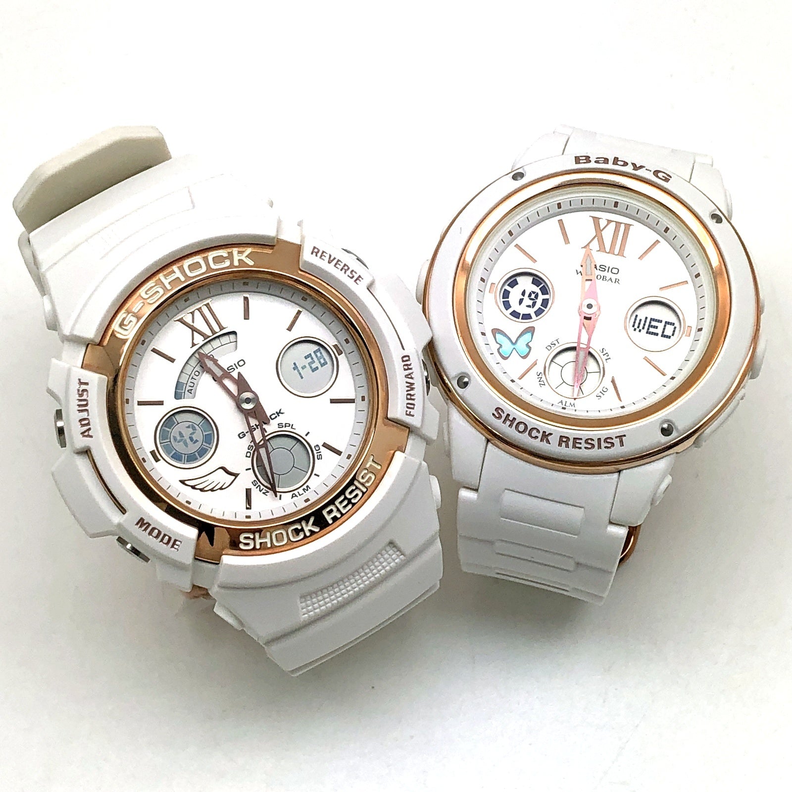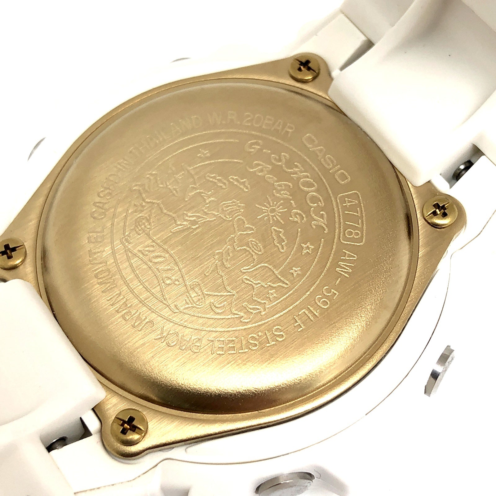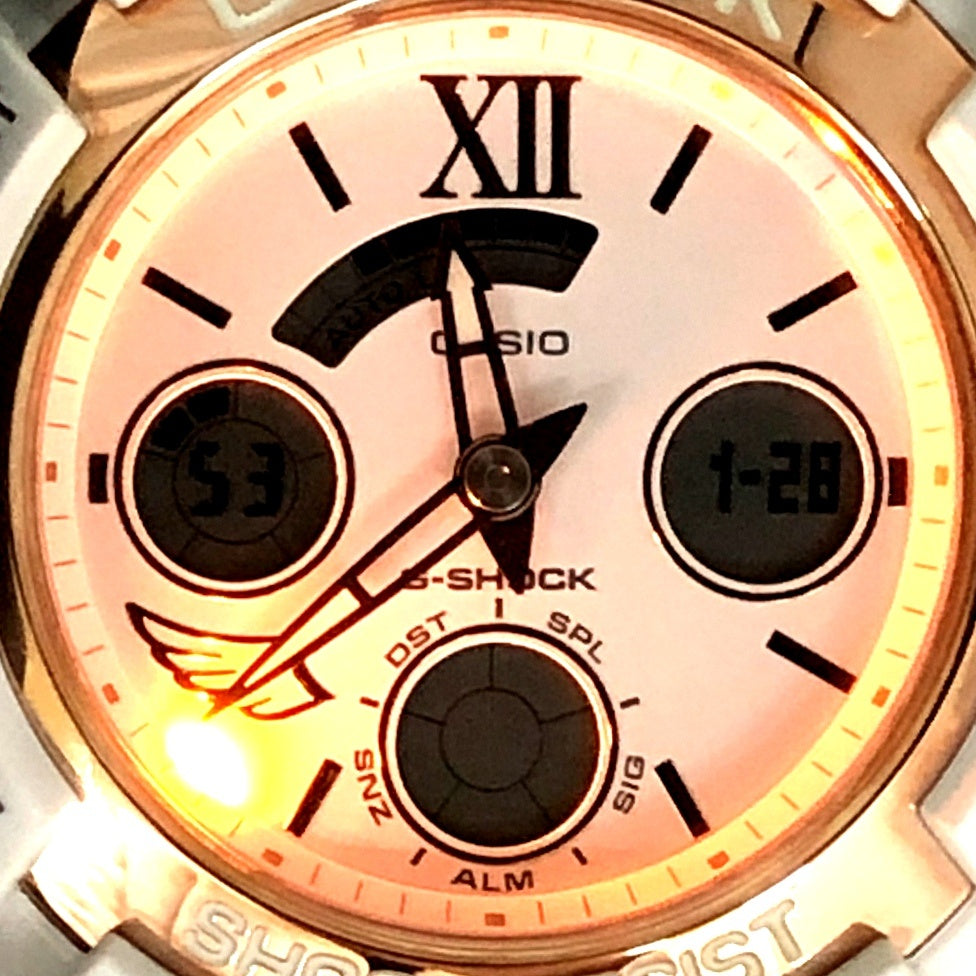 | コメント | 2018年11月に発売された、毎年クリスマス限定ペアウォッチとして人気の「G Present’s Lover’s Collection(ジープレゼンツラバーズコレクション)」です。2018年は「Love is tough」がテーマとなっており、苦難を乗り越え永遠の愛を貫いた神(キューピッド)と人間(プシュケ)が表現されています。ベースにはメタルベゼルが採用されたアナログ/デジタルモデルAW-591とBGA-150が採用され、ベゼルとバンドにはホワイトが採用され、ベゼルリングやインデックス、時分針などのメタルパーツにはゴールドが配色されています。裏蓋にはラバーズコレクションのシンボルマークである「天使と悪魔」が刻印され、G-SHOCK35周年を記念してゴールドIPが施されています。 |