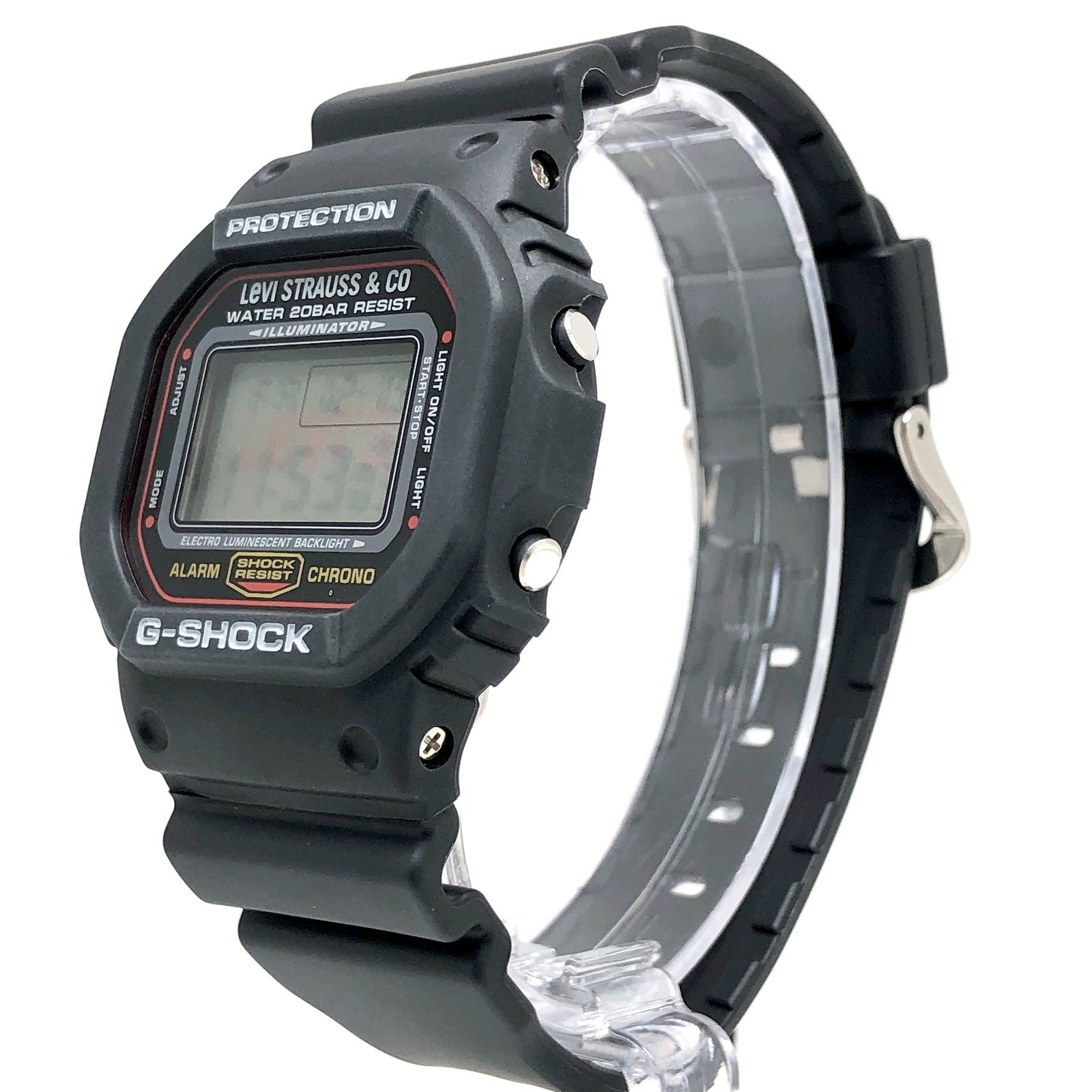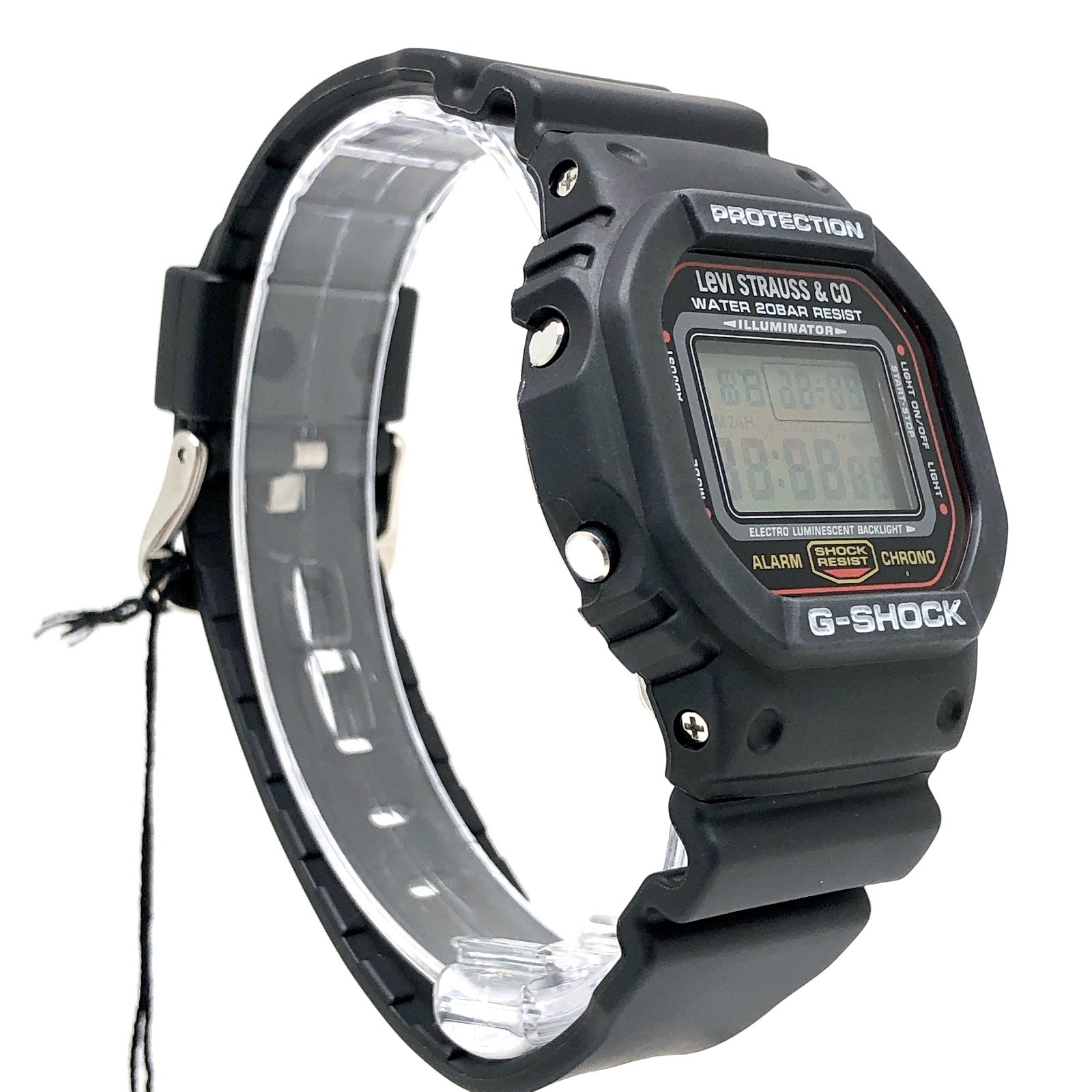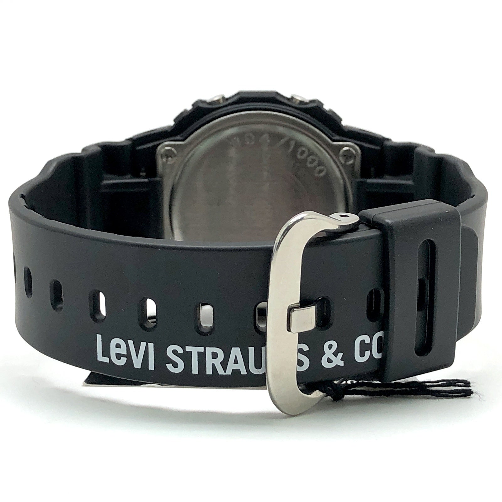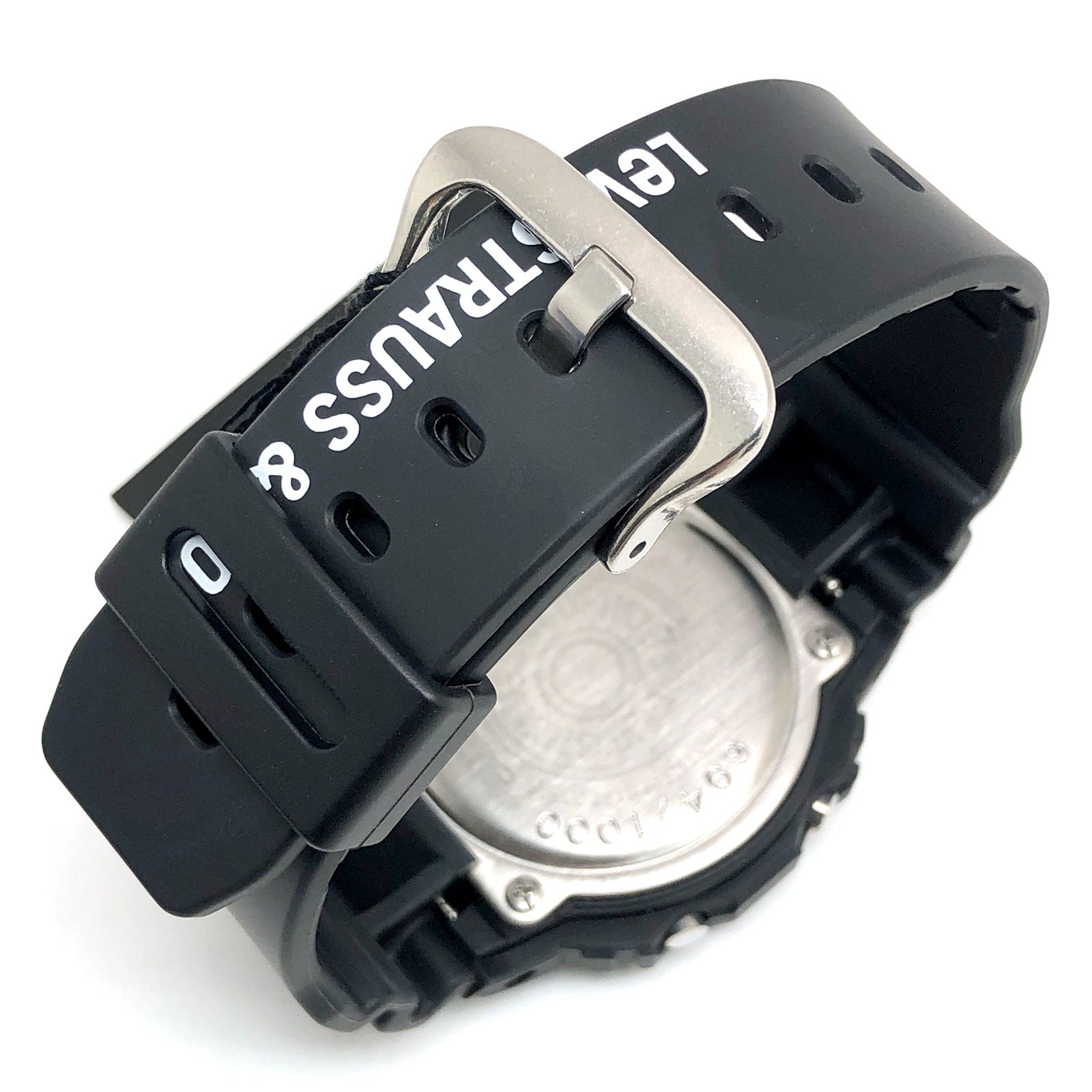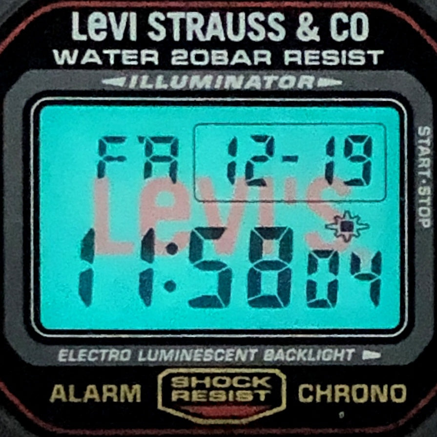 | コメント | 2002年7月に限定1000本で発売された、アメリカ・サンフランシスコで1853年にリーバイ・ストラウス氏が設立した老舗ジーンズ・アパレルメーカー「Levi's」とのコラボレーションモデル。ベースにはスクエアデザインが人気のDW-5600が採用され、文字盤やバンドにはブランドロゴがデザインされています。裏蓋にはジーンズのボタンのデザインとシリアルナンバーが刻印され、ELバックライト発光時にはロゴが浮かび上がります。 |