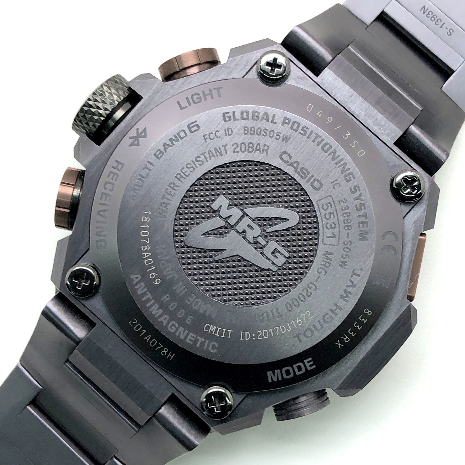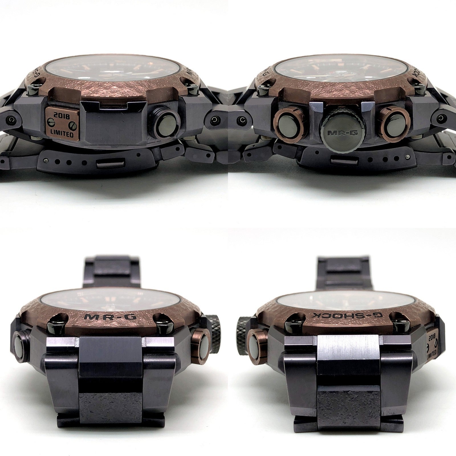 | コメント | 2018年6月、G-SHOCKの誕生35周年に世界350本限定で発売された、G-SHOCK最上級ラインMR-GのBluetooth搭載GPS電波ソーラーモデル「鉄鐔 TETSU-TSUBA」」。日本刀の装具「鉄鐔(てつつば)」がモチーフになっており、ベルトとベゼルには日本伝統の鎚起技法を、鎚起師・浅野美芳氏により1点づつ丹念に打ち起こされており、さらに最先端のコーティング技術であるAIPにより、金属工芸特有の色調に着色されています。日本の匠の技と先進の技術が融合したG-SHOCK最高峰のモデルです。 |