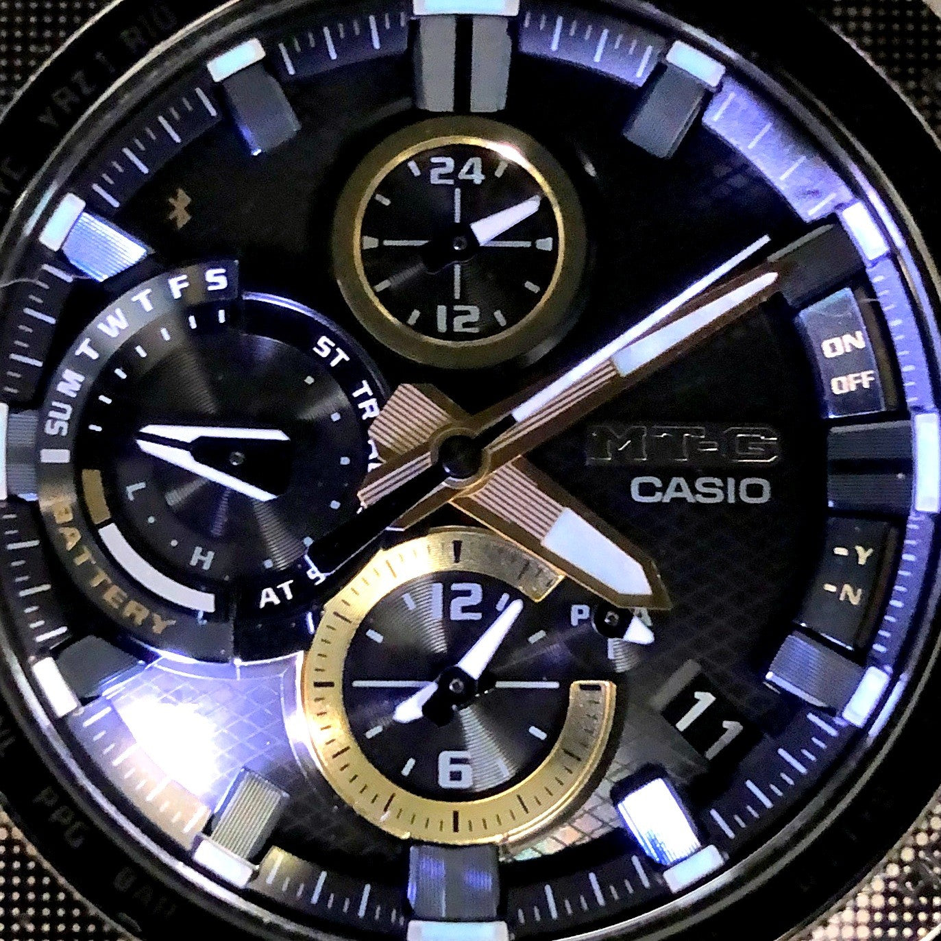 コメント | 2019年11月に発売された、メタルと樹脂が融合したMT-Gのカモフラージュ柄モデル。ベースには、電波ソーラーやモバイルリンク機能を搭載したMTG-B1000シリーズを採用し、ベゼルとバンドにはブラックIP処理のあとに、特殊なレーザー彫刻でドットパターンの迷彩柄が施されています。バンドには裏側に軽量かつ耐久性に優れたファインレジンパーツを組み合わせた「レイヤーコンポジットバンド」を、風防には透明度の高いサファイヤガラスが採用されています。Bluetooth通信機能で専用アプリを接続することにより正確な時刻情報を取得することができます。 |